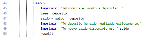 En el caso 2, se permite realizar el deposito de dinero, por lo que se le solicita al usuario que introduzca el monto que desea depositar, el cual se sumara al saldo disponible que tenia en el momento. Se mostrara un mensaje notificando que se ha realizado con éxito esta acción y se mostrara el nuevo saldo disponible, luego del deposito.