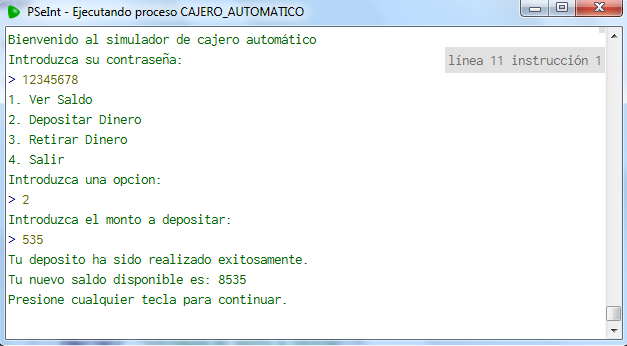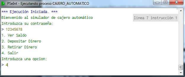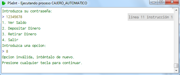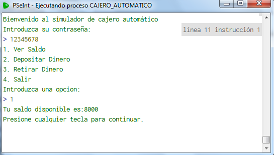 Si introducimos la contraseña correcta, se nos muestra el menú de opciones y si introducimos el numero 1, el cal corresponde a mostrar el saldo, inmediatamente se vera reflejado nuestro saldo en pantalla.