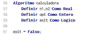 Se declaran las dos variables n1 y n2 que son de tipo real, opt de tipo entero y exit que es de tipo lógico.