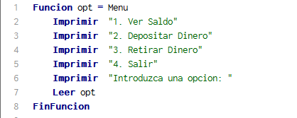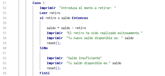 Si el usuario introduce el numero 3, el cual corresponde a la opción de retiro de dinero, debemos utilizar una estructura condicional, ya que se puede presentar el caso de que quiera retirar un monto mayor al disponible, por lo que se establece la condición en la cual si el monto introducido por el usuario es menor o igual al disponible se procede a realizar el retiro, pero si esto no se cumple, entonces se le mostrar un mensaje notificando que el monto es insuficiente y se muestra en pantalla el saldo que tiene disponible el usuario.