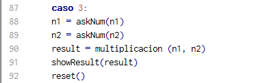 Ahora bien, el caso 3 permite realizar la operación de multiplicación, al igual que en los casos anteriores, se llama la result = multiplicacion (n1, n2) para realizar la multiplicación de los dos números introducidos por el usuario.