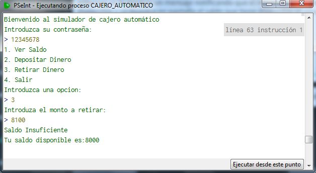 Sabemos que el monto disponible es de 8000, pero si al seleccionar la tercera opción introducimos un monto a retirar de 8100, se nos muestra el mensaje Saldo Insuficiente y nos muestra cuanto tenemos disponible.