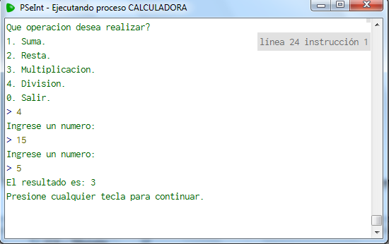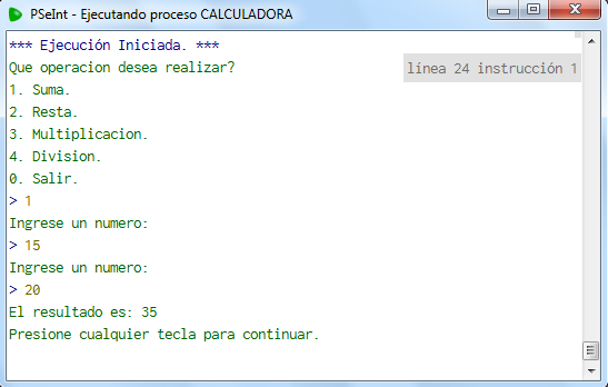Vemos que al introducir la opción 1, se nos solicita introducir dos numero y luego se muestra el resultado de la suma y un mensaje que indica que al presionar cualquier tecla se puede volver al menú de opciones.