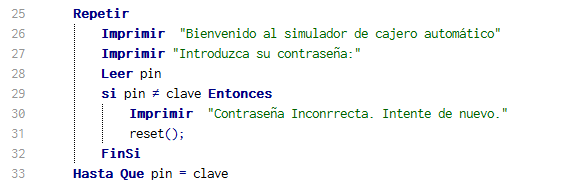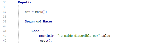 Luego de validar la contraseña, iniciamos una nuestra repetición para contemplar las diferentes opciones que se ofrece en el menú. Es por ello que inicialmente llamamos a la función menú para mostrarle al usuario las opciones disponibles.