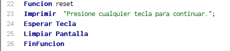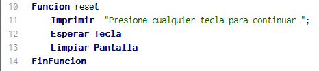 También es necesaria crear la Funcion reset, con la cual se le indica al usuario que debe presionar presionar cualquier tecla para continuar y que se limpie la Pantalla, retornando al Menú principal.