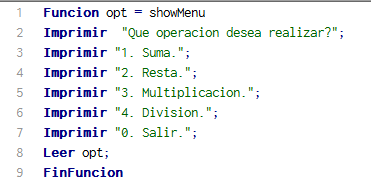 Iniciamos creando las funciones fuera de nuestro algoritmo, así que la primera función sera la de las opciones del menú, en la cual se le indica al usuario las operaciones que puede realizar este programa, en este caso serian: suma, resta, multiplicación. división y la opción para finalizar el programa.