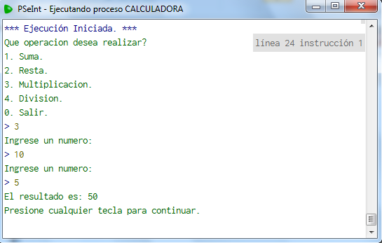 como podemos observar, al seleccionar la opción 3, podemos visualizar el resultado de la multiplicación de los dos números.