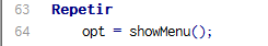 Iniciamos una estructura de control de repetición, en este caso repetir y llamaremos la opt = showMenu(); para que el usuario visualice el menú de opciones.