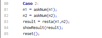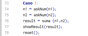 Ahora bien, si el valor introducido por el usuario es 1, estableceremos el Caso 1, esta opción le ofrece a los usuarios realizar la suma de 2 números, estos valores serán almacenados en la variable n1 y n2, los cuales serán obtenidos a través de la función askNum(n). El resultado de la operación sera almacenado en la variable result y luego se llama la función showResult(result) para mostrar el resultado y seguidamente la función reset(); para que el usuario pueda volver al menú principal al presionar cualquier tecla.