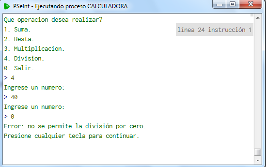 Al ejecutar el programa y seleccionar la opción 4, podemos introducir dos números, pero si el segundo numero es 0, entonces se muestra el mensaje de error, indicando que no se permite la división por 0.