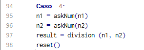 En el caso de elegir la opción 4, se establecer el caso 4 en el cual se leen los dos numero y se llama la función result = división (n1, n2) para que se realice la división de los dos números.