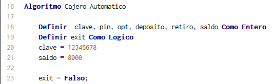 Inicie la variable Saldo con un valor de 8000 y a Clave le asigne el valor: 12345678, esta variable sera utilizada para validad el acceso del usuario a las operaciones del cajero automatico.