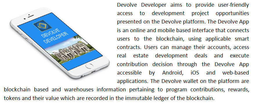 Devolve Developer will reshape the real estate industry with the emergence of a new business model leveraging a decentralized technology that creates access, increases efficiencies and reduces costs. Empowering individuals around the world with a trusted and transparent technology, Devolve Developer will discard many of the conventional hindrances and create a fully interconnected global economy that is completely peer-to-peer contributing to improved worldwide capital flow.