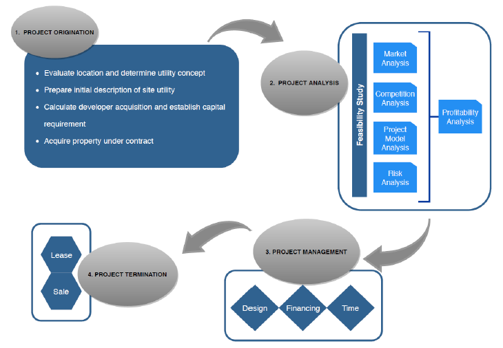 Real estate development process is a dynamic, multifaceted, and multi-disciplinary venture that encapsulates four general phases. When the process is executed the phases are not mutually exclusive or occur sequentially, commonly projects are depicted by parallel procedures, overlaps and feedback reiterations impacts.