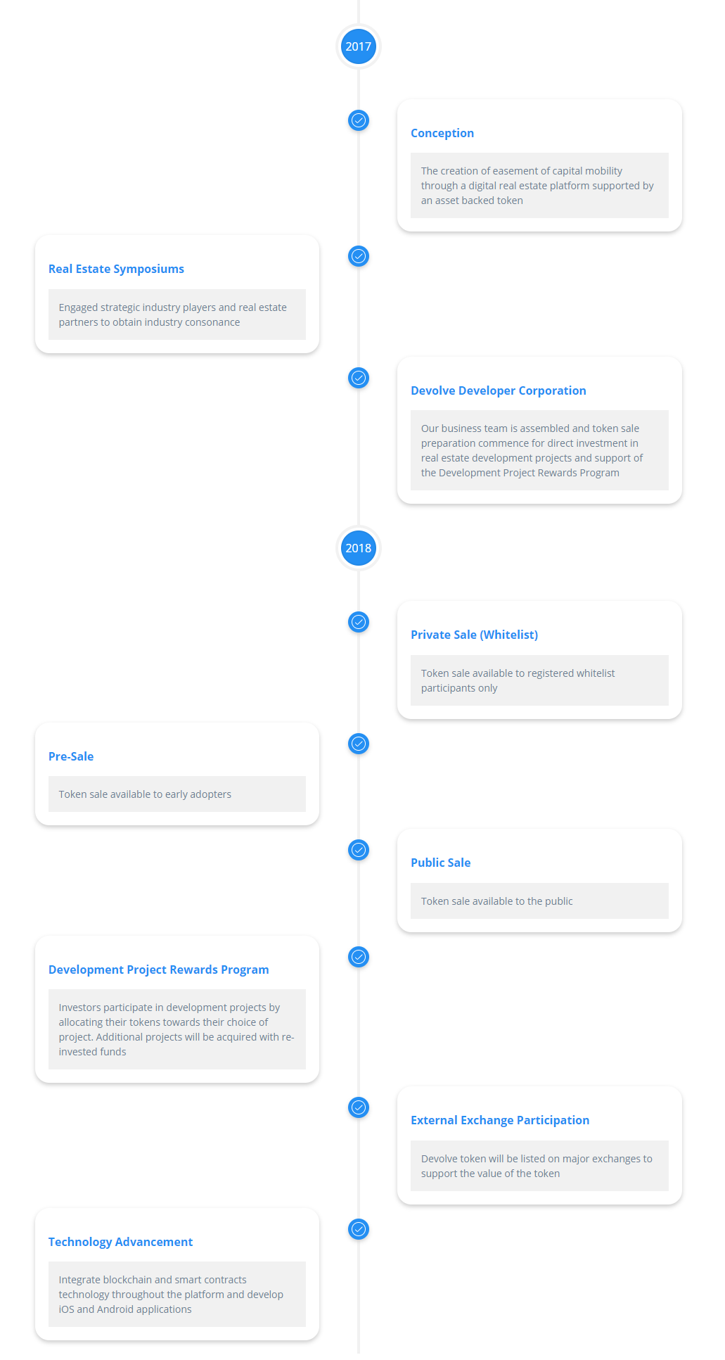The Devolve Platform is the first high quality system, backed by hard assets and engaging in large real estate development projects suitable for both institutional and individual investors. Although this primary real estate market produces higher returns than the retail market, it is heavily undercapitalized by private investment due to their high barriers of entry. Utilizing blockchain technology and smart contracts, Devolve Developer tokenized large scale development projects by pooling various types of illiquid contractual projects and improving accessibility of their cash flows and enhanced equity positions creating reward-producing tokens that are easily tradeable.