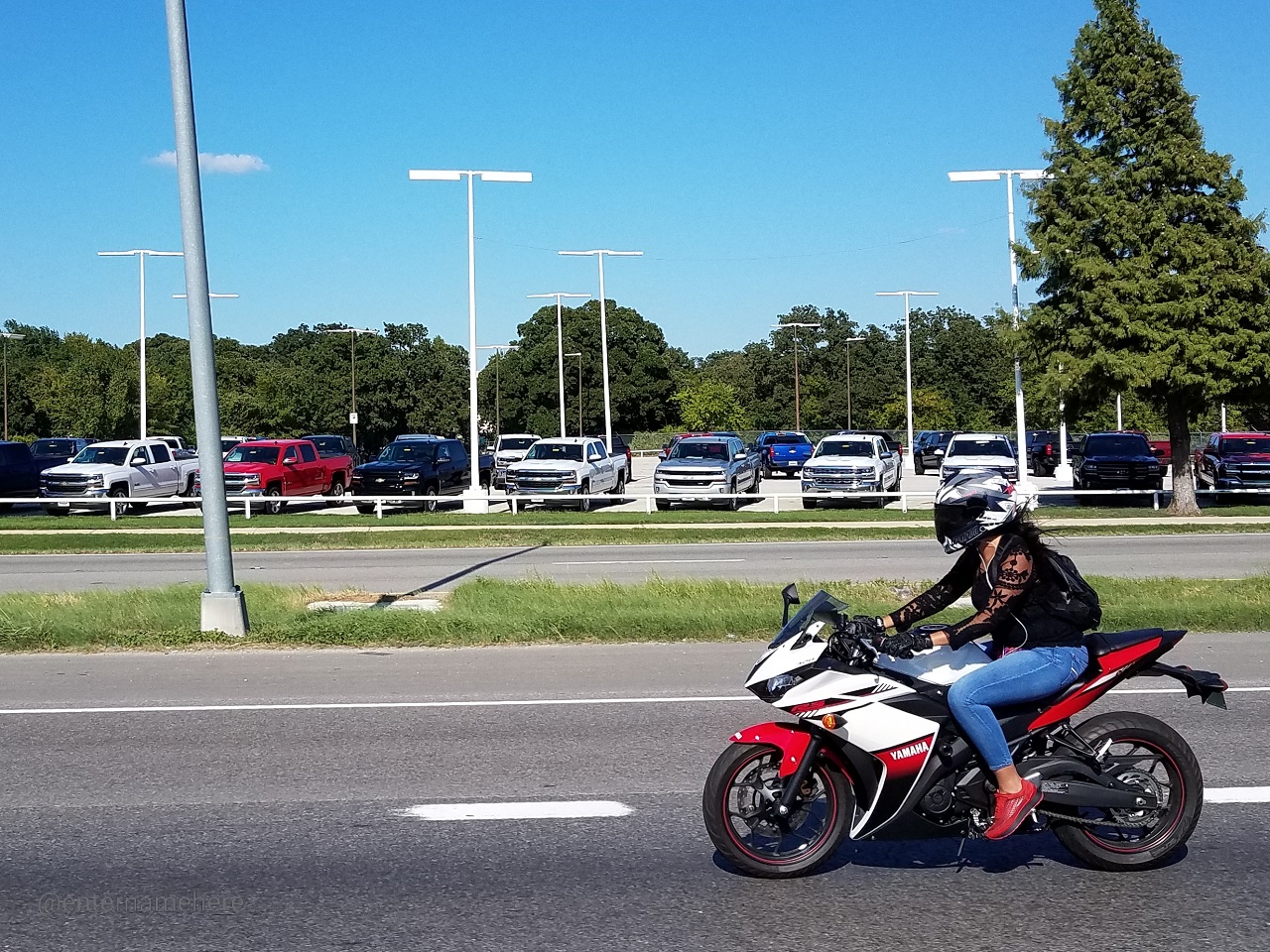 Seeing a lady on a bike is not uncommon; seeing a lady in lace on a bike, now that’s photo-worthy. Side note: right after she went by, another chick on a bike flew past. She was in leathers, and she was way too fast for me to catch a pic.