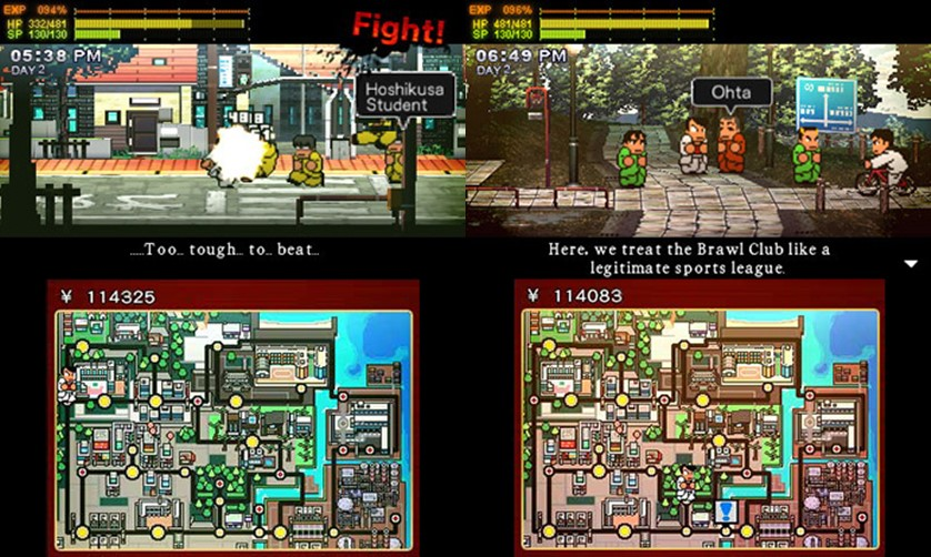 โดยเกมเพลย์แทบจะถอดแบบมาจากต้นฉบับบนแฟมิคอม ที่เป็นแอ็คชั่นต่อยตีแบบกำจัดศัตรูให้หมดฉาก และมีระบบพัฒนาตัวละครเช่นการซื้อหนังสือในร้านเพื่อมาอัพเกรดท่าไม้ตายตัวละคร ซึ่งภาคนี้ยังเสริมระบบเลเวลที่ลงลึกในรายละเอียดที่มากกว่าเดิม เราสามารถเลือกอัพเกรดค่าพลังได้ละเอียดมากขึ้น แต่ก็ไม่ซับซ้อนอะไร ส่วนค่าพลังชีวิตหรือ HP ก็จะอัพเกรดเมื่อเราได้สวมใส่เสื้อผ้าและอุปกรณ์เสริมใหม่ๆ ที่มีขายในเกม