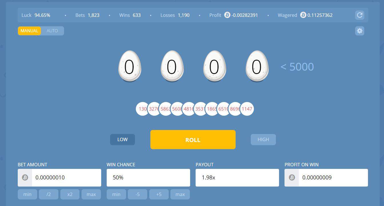 Playing Duckdice is simple as is any dice game. The interface is set up in a neat way with four egg shells which represent the numbers of your roll outcome. The highest multiplier you can win in Duckdice is 9900x. Winning a bet like this would require you to roll under 1 or over 9998. Before you assume that kind of win is too difficult let me say it isn't. In fact many players have hit this mulitplier already so you can certainly be the next lucky player to do so.