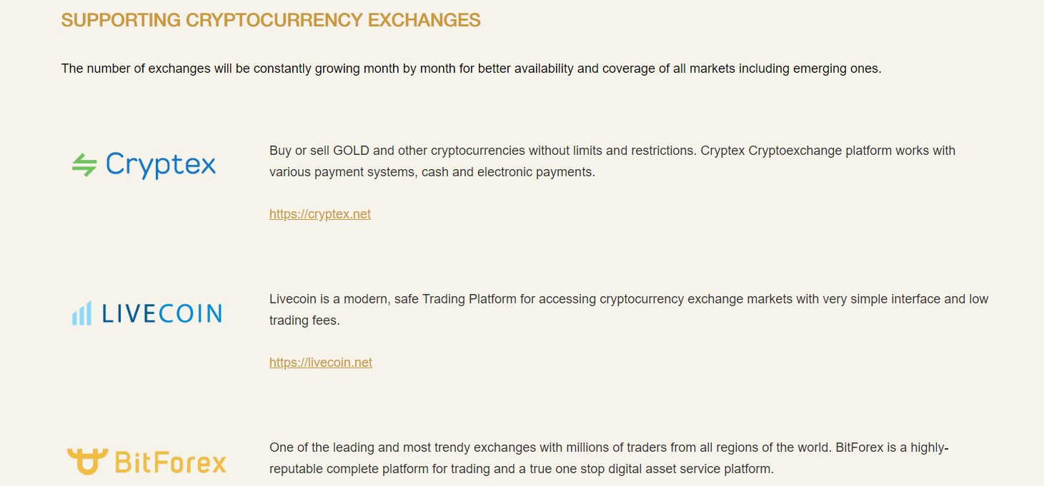 Comprar ouro requer muita papelada e um processo bastante demorado, além do custo de garantir o próprio ouro físico. O token GOLD facilita aos investidores a compra de ouro real de maneira conveniente e anônima, usando qualquer dispositivo habilitado para Internet, sem aborrecimentos ou documentos legais, facilitando o investimento das pessoas no ouro.