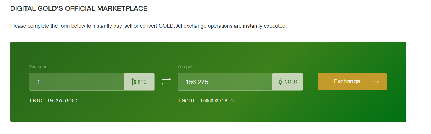 A empresa controladora da GOLD - DIGITAL GOLD LIMITED, fornecedora de liquidez, facilita transações de grande volume (compras e vendas) usando o mercado nativo da plataforma Digital Gold - o Digital Gold Marketplace e outras trocas de parceiros secundárias. Isso garante que exista um mercado pronto, independentemente da natureza e do volume da transação.