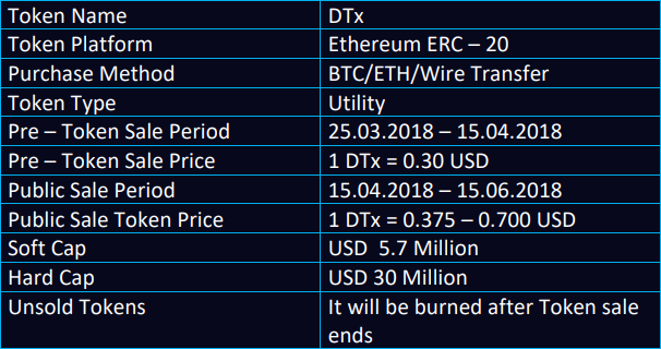 Perusahaan telah datang dengan konsep token DTx yang didasarkan pada platform Ethereum ERC 20 yang dapat dibeli menggunakan BTC, ETH atau Wire transfer. Token ini dapat digunakan untuk membayar biaya untuk berbagai layanan yang mereka berikan. Dan juga mereka akan membantu untuk mendapatkan pedagang komisi yang baik dalam perdagangan. Perusahaan akan menggunakan dana yang dikumpulkan oleh token ini untuk pengembangan dan perluasan perusahaan mereka. Harga satu token penjualan publik adalah sekitar 0,375 - 0,700 USD sedangkan harga harga Jual pra-Token adalah 0,30 USD. Alokasi token ini sederhana di mana tim pendiri akan menyimpan 20% sementara 50% dari itu akan dijual untuk umum. Sisanya akan disimpan untuk penasehat, rujukan dan untuk program hadiah.