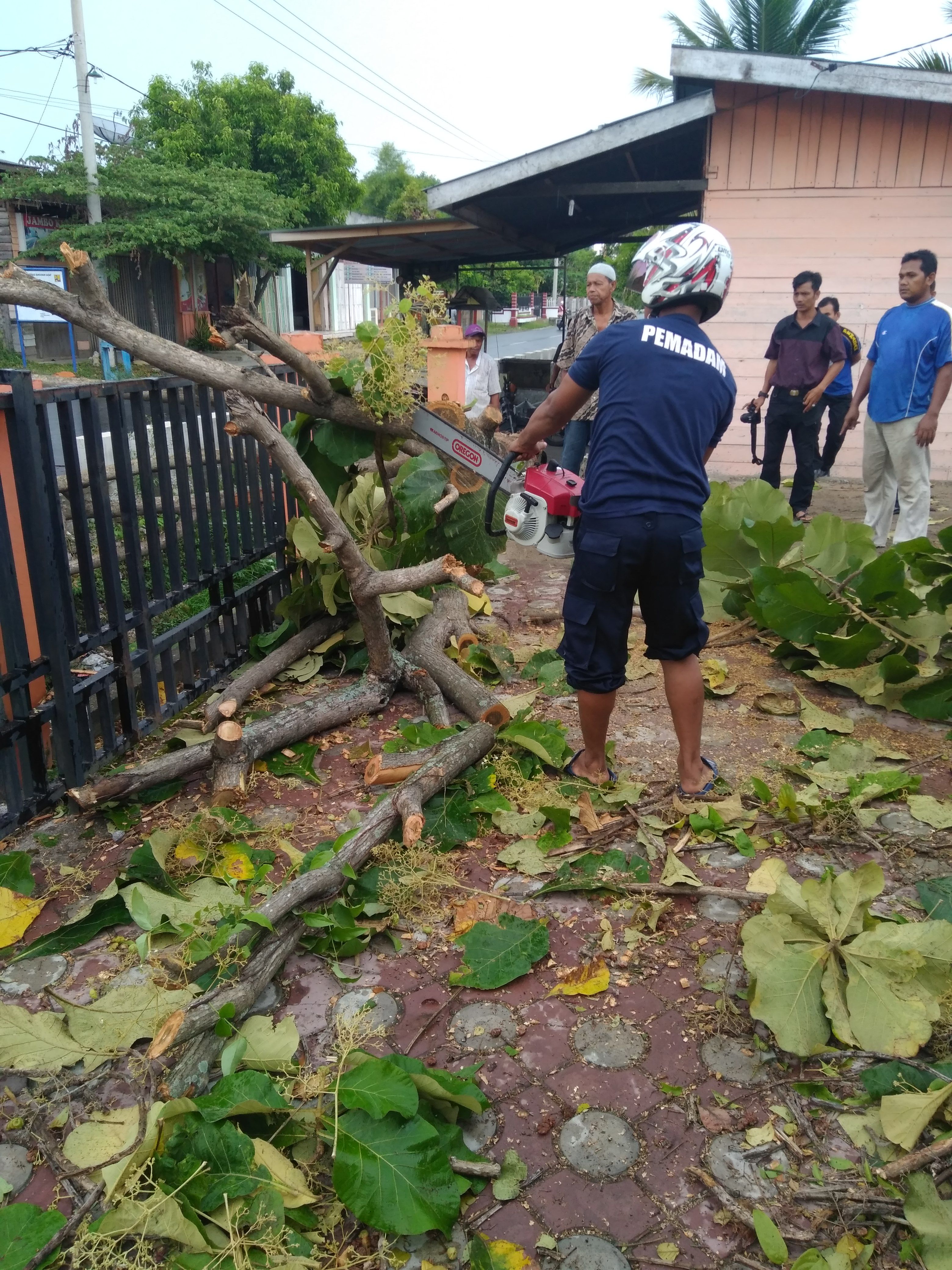 Memotong pohon kelapa dan pohon besar yang menimpah toko dan rumah warga.