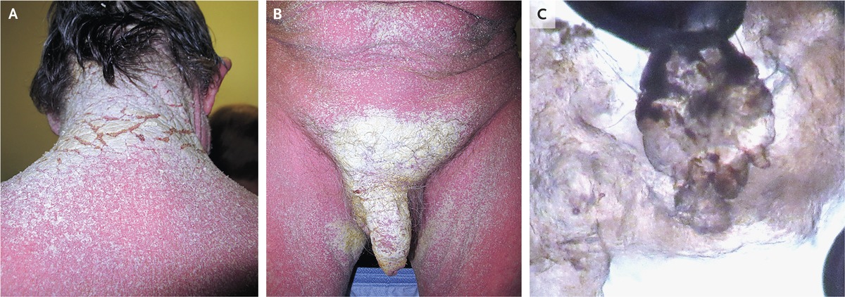 • The scabies rash is often apparent on the head, face, necks, palms and soles of the feet in infants and very young children but usually not in adults and older children
