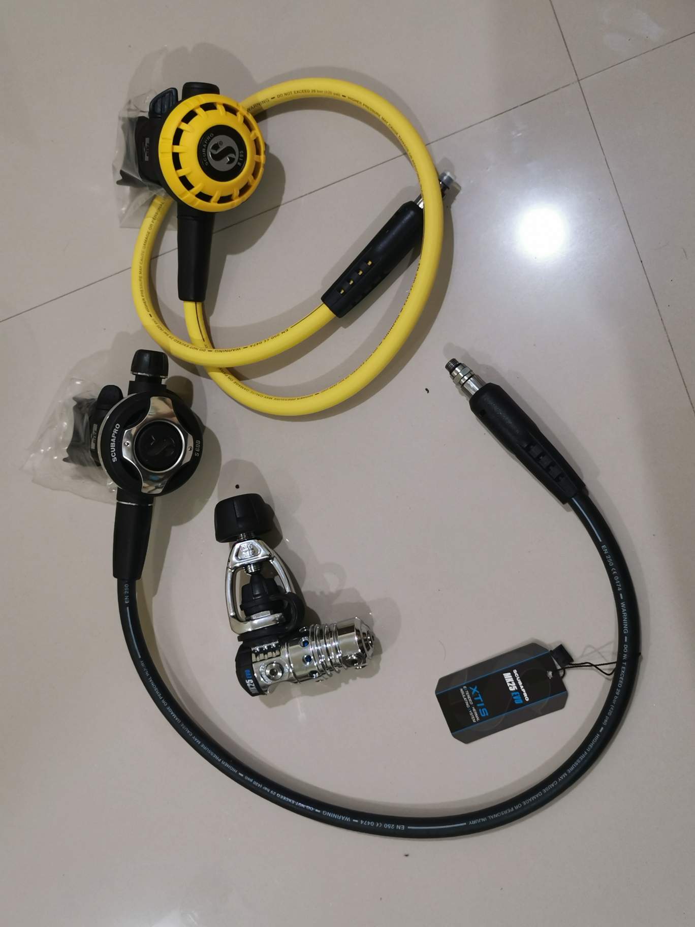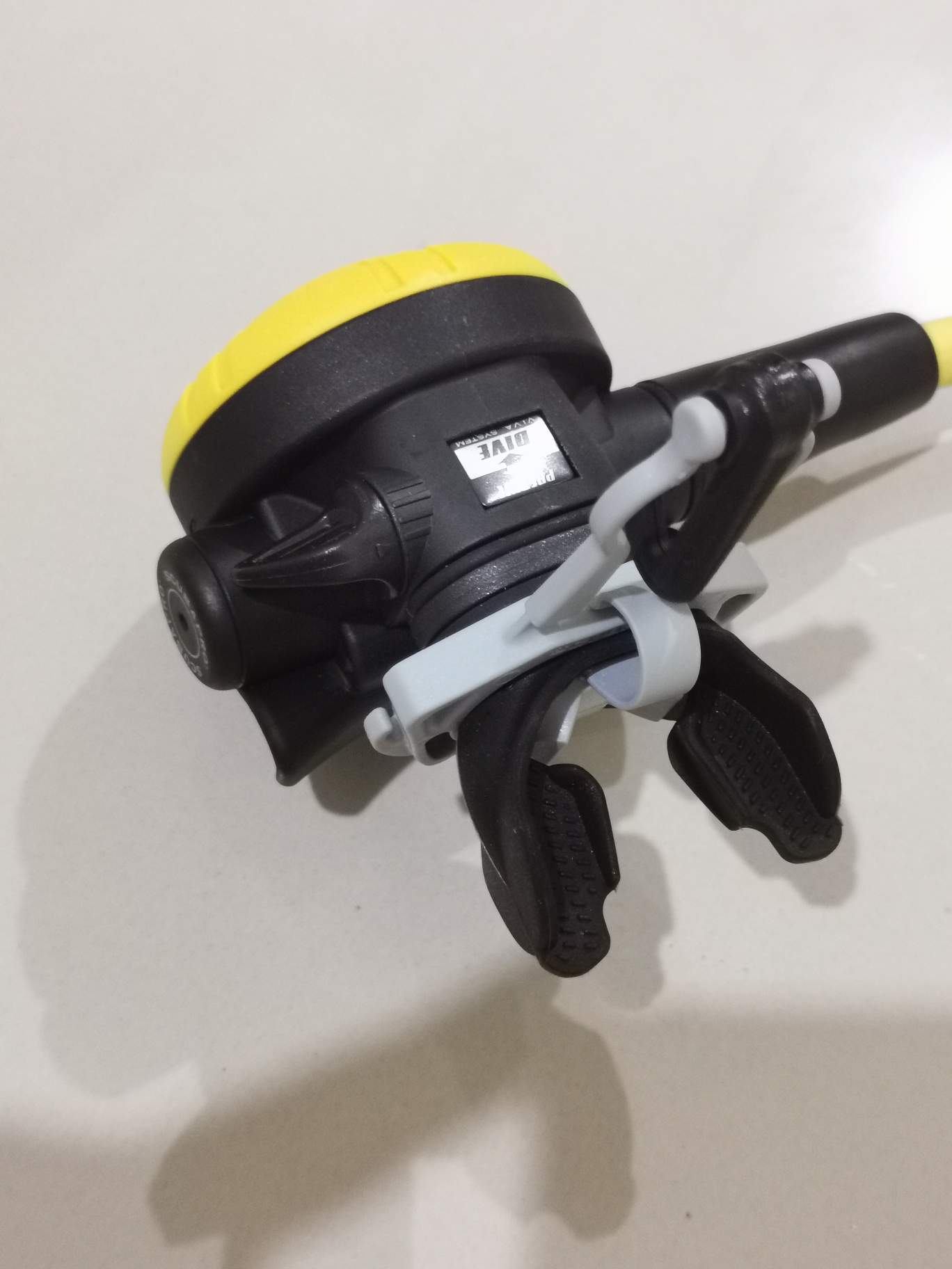 - Рядом 2-я ступень и октопус(жёлтый). 2-я ступень s600 тоже очень крутая с регулируемой подачей воздуха, что позволяет уменьшить сопротивление на вдохе и при необходимости экономить воздушную смесь из балона. Октопус без особых наворотов, да они ему и не нужны, это запасная 2-я ступень, на случай если у кого-то закончиться воздух и он сможет дышать моим.