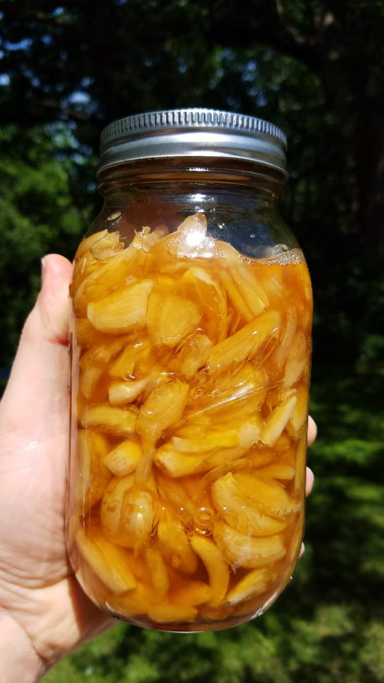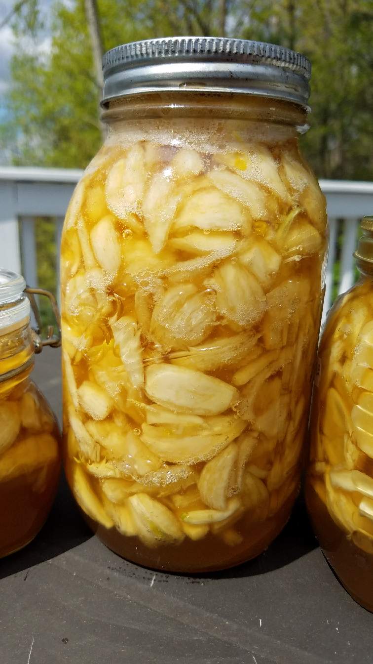 This photo is after about 3 weeks. The honey will get thinner over time, and the garlic gets darker.