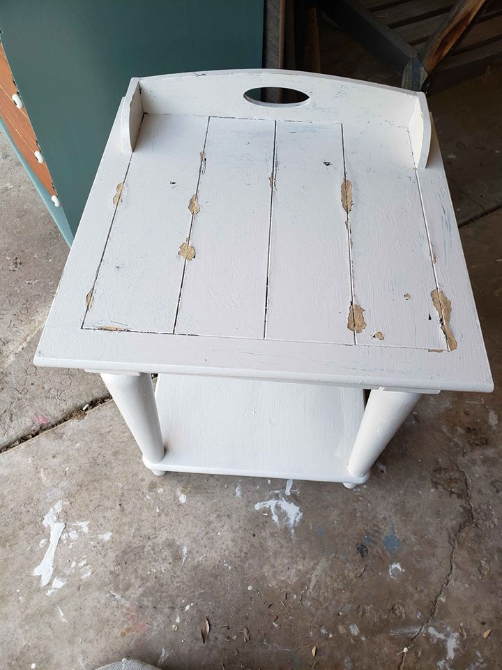 When I found it, it was black, and since it is made from pressed board, it had some water damage and slight bubbling at the surface of the top of the table. Originally, I planned to scrape the bubbling off and then just paint over it, but I once I painted it, and did some re-scraping, I realized that I actually really liked the chippy way that it turned out, so I left it! What once was a water damaged black table destined for the trash, is now a super cute piece ready to sell!!