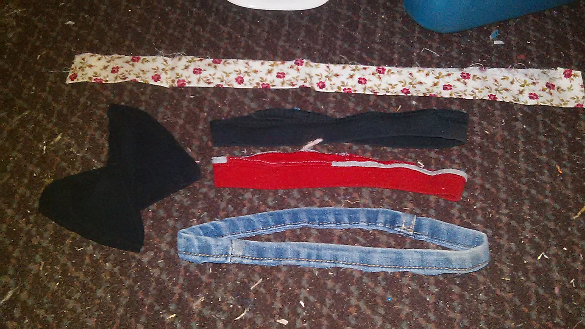 The collars cut out of 3 old T-shirts(I used 2 shirts and the bottom hem of an old pair of jeans).