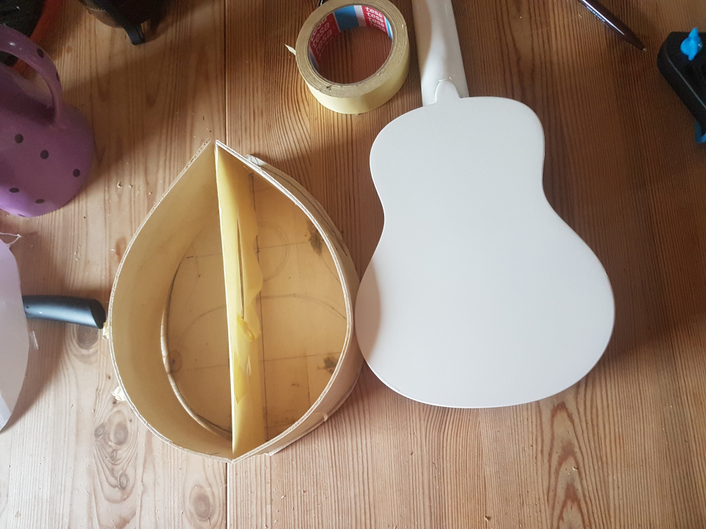 Thanks. Yes I have taught myself to play a few chord progressions on the ukulele and the same ones on my daughters guitar. It is definitely easier on the uke. The back of my ukulele is similar to a lute in that it has the leaf shaped parts that make the back curved, but is also has a rim like on a ukulele. I havent really followed any rules. I just made it up as I went along. I use normal wood glue , but it is also possible to use bone glue or hideglue, I am not sure whether it is easier or harder than woodglue, but woodglue is easier to come by.