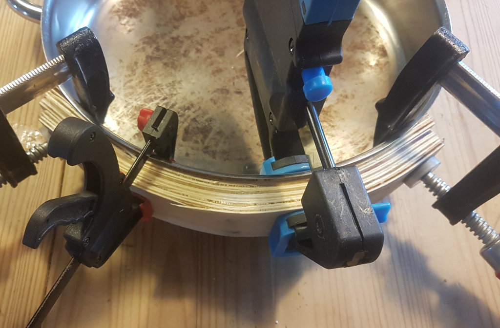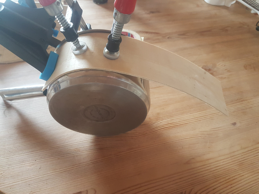 the first step was shaping the body. i Took the thin sheats of lowquality wood and soaked them in hot water, the tried bending them over some of my pot and pans. This worked fine and even though it took longer than i liked to dry and set it is absolutely a viable technique for the DIY instrumentmaker. I did them in batches and I would have probably do them one at a time next time.