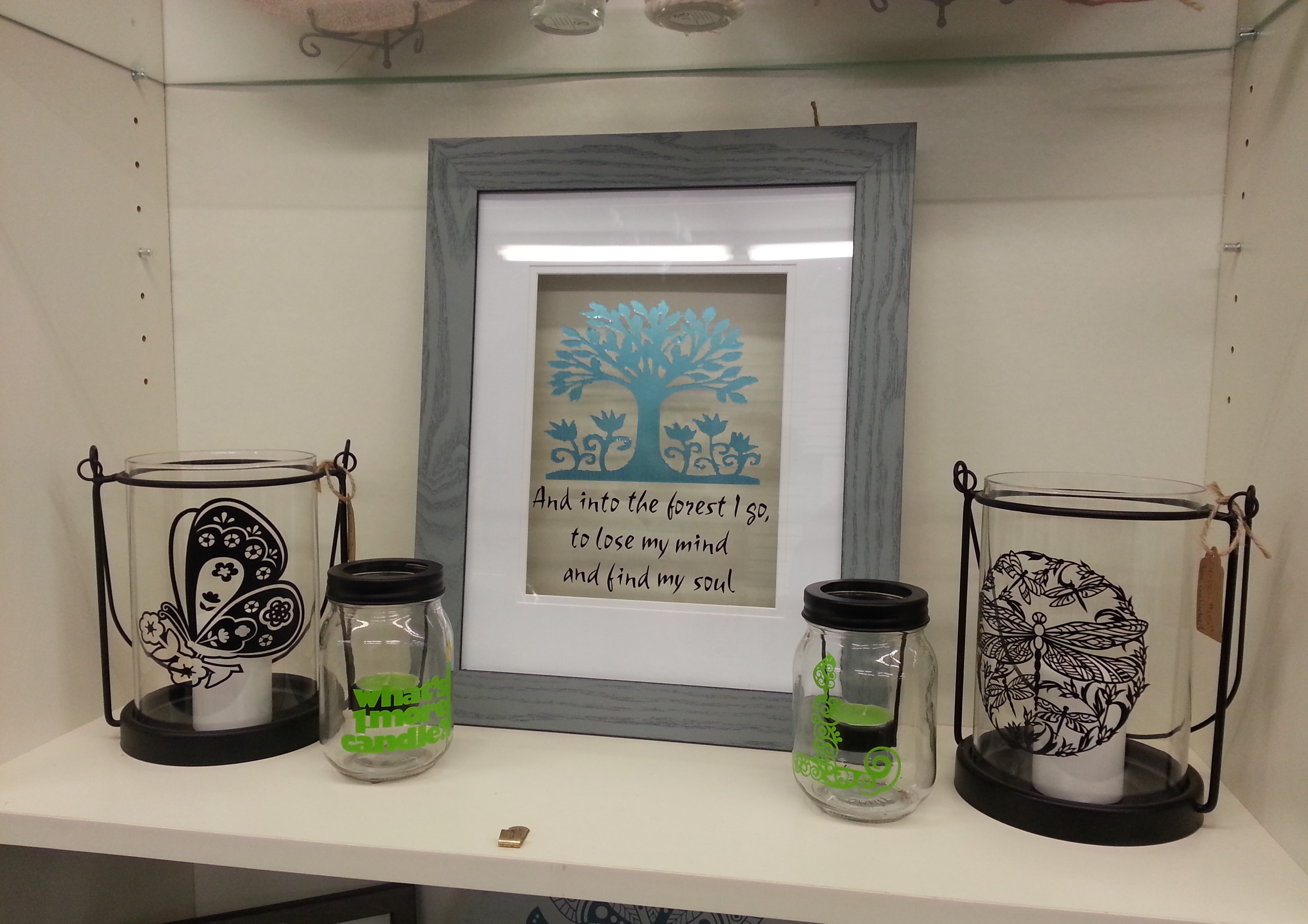 In the pictures above you can see many examples of the vinyl decals on glass. Below you can see the vinyl stuck on clear coated wood.