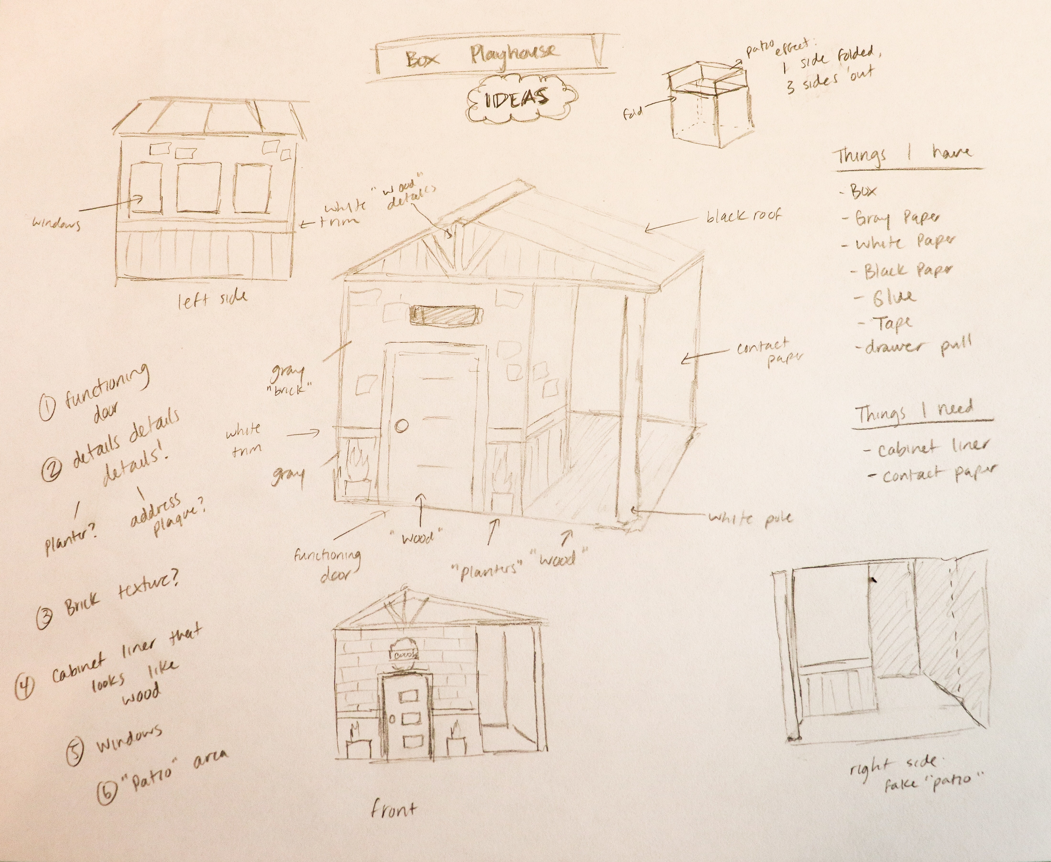 At the start of every project, I break out a clean sheet of paper and fill it with ideas that I like. I'll try to get some inspiration from Pinterest or Instagram first, then I'll write chicken-scratch notes, draw quick sketches, and just jot down an overall brainstorm for the project. The planning paper is not meant to be perfect, just meant to get the ideas out of this brain of mine. By the time I'm finished, it usually looks like a pencil got into a war with the paper, and the paper lost.