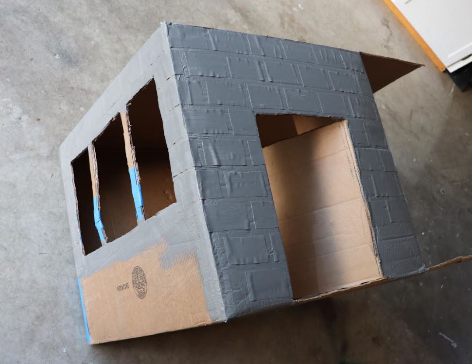 Bam! Windows were cut and we were ready to move on to the other side of the box! I had already cut a rectangle-shaped door in the front of the box with three cuts, leaving one side of the door attached.