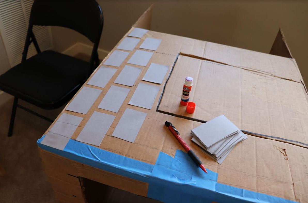 Now that the walls of the playhouse were framed, it was time to start on the details. I wanted the walls to have a brick-like texture, so I took gray construction paper and cut it into small, same-size rectangles that I would use for "bricks."
