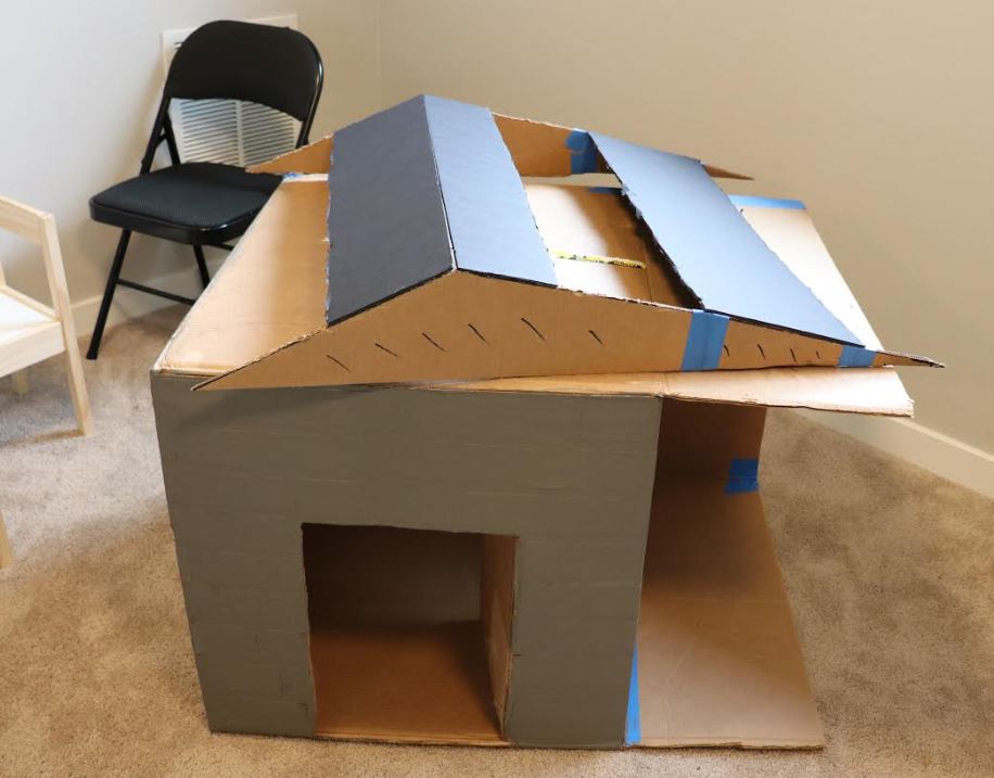 After the paint had dried, I brought the playhouse back inside and started working on the roof. I used the leftover cardboard pieces I cut off from the folds at the beginning and some extra pieces of cardboard to build the roof frame. I needed the roof frame to match the length and width of the flat top of the playhouse, and wanted the highest point of the roof to be 6" tall, so I calculated and drew out the measurements on the leftover pieces of cardboard with a marker. I used straight lines to get the triangle shapes to match and used a knife to cut out the matching pieces. After all of the pieces were cut, I joined the pieces together with hot glue and tape.
