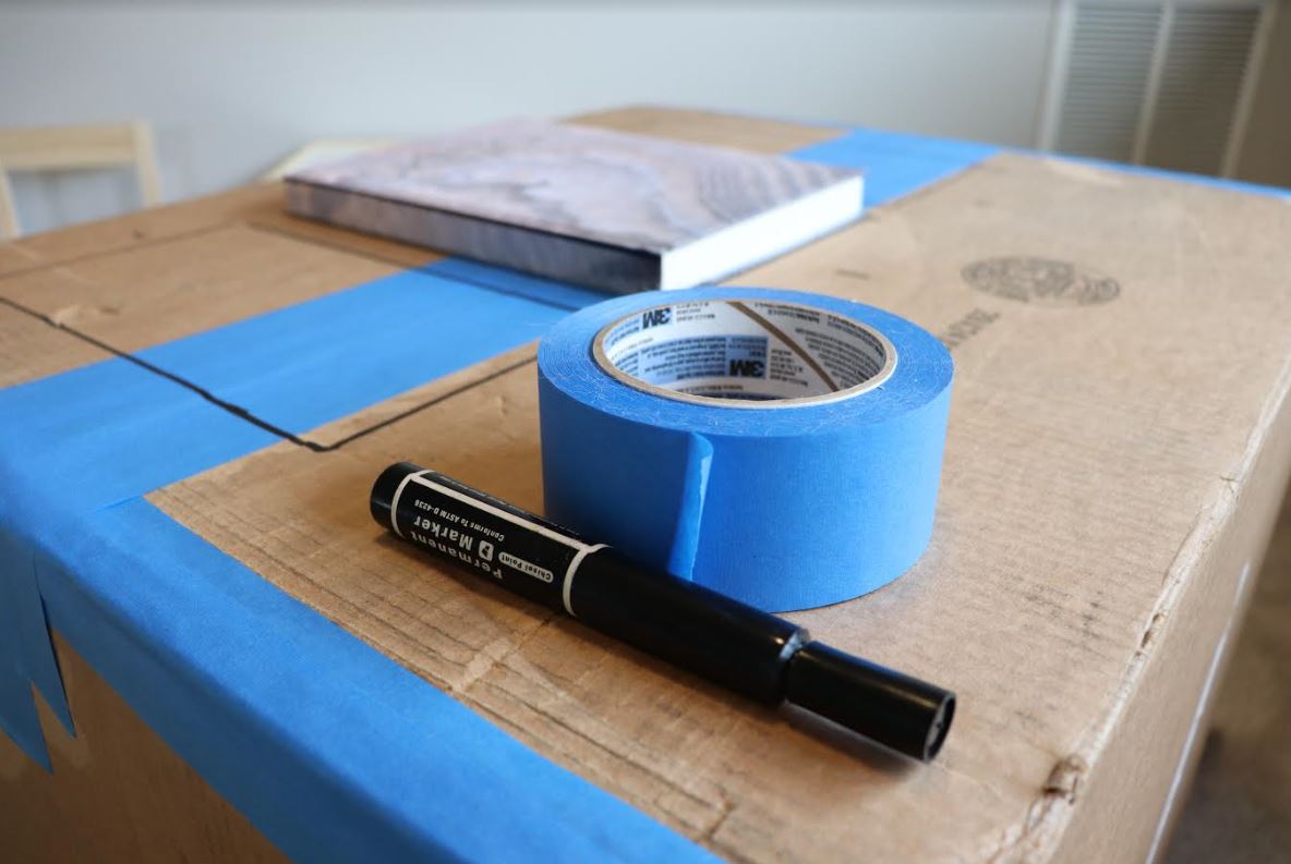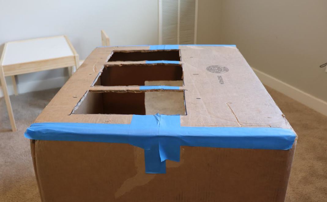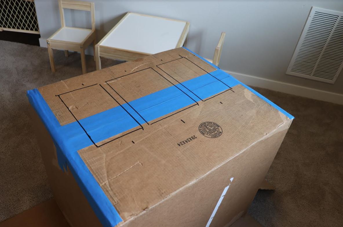 In the photo below, you can see how I taped the 'North' and 'South' folds together from the previous step. Please note that I used painter's tape. If I could do this project again, duct tape would be the way to go! Unfortunately, painter's tape was all I had available for this project and I made it work! I taped the edges of the box for the window side to get rid of gaps and close the wall on that side. After that, I used a nice big marker and traced the edges of some books to draw out three window shapes.