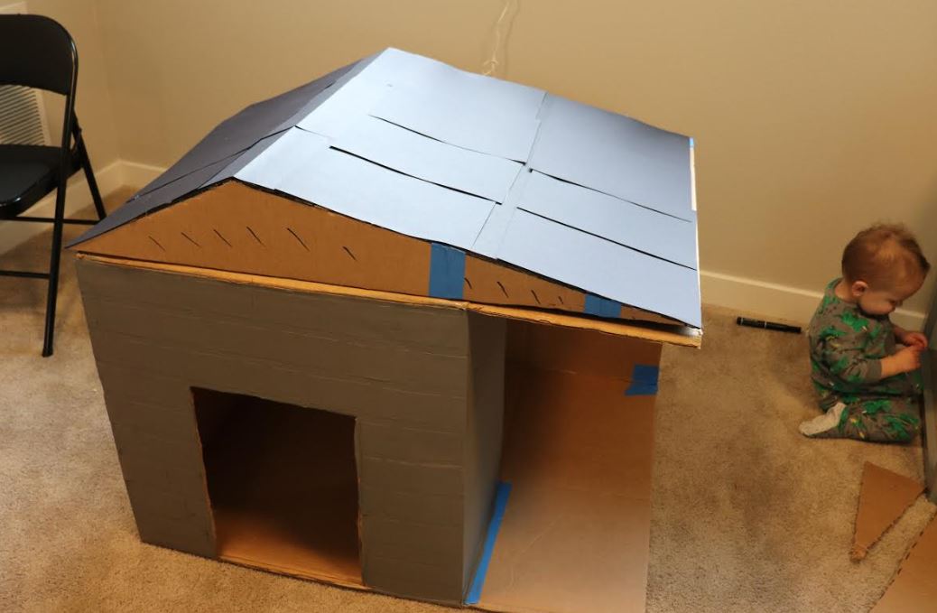 Next, I used hot glue to put a layer of construction paper over the entire frame until it was completely covered. I used hot glue to attach the roof to the top of the playhouse.