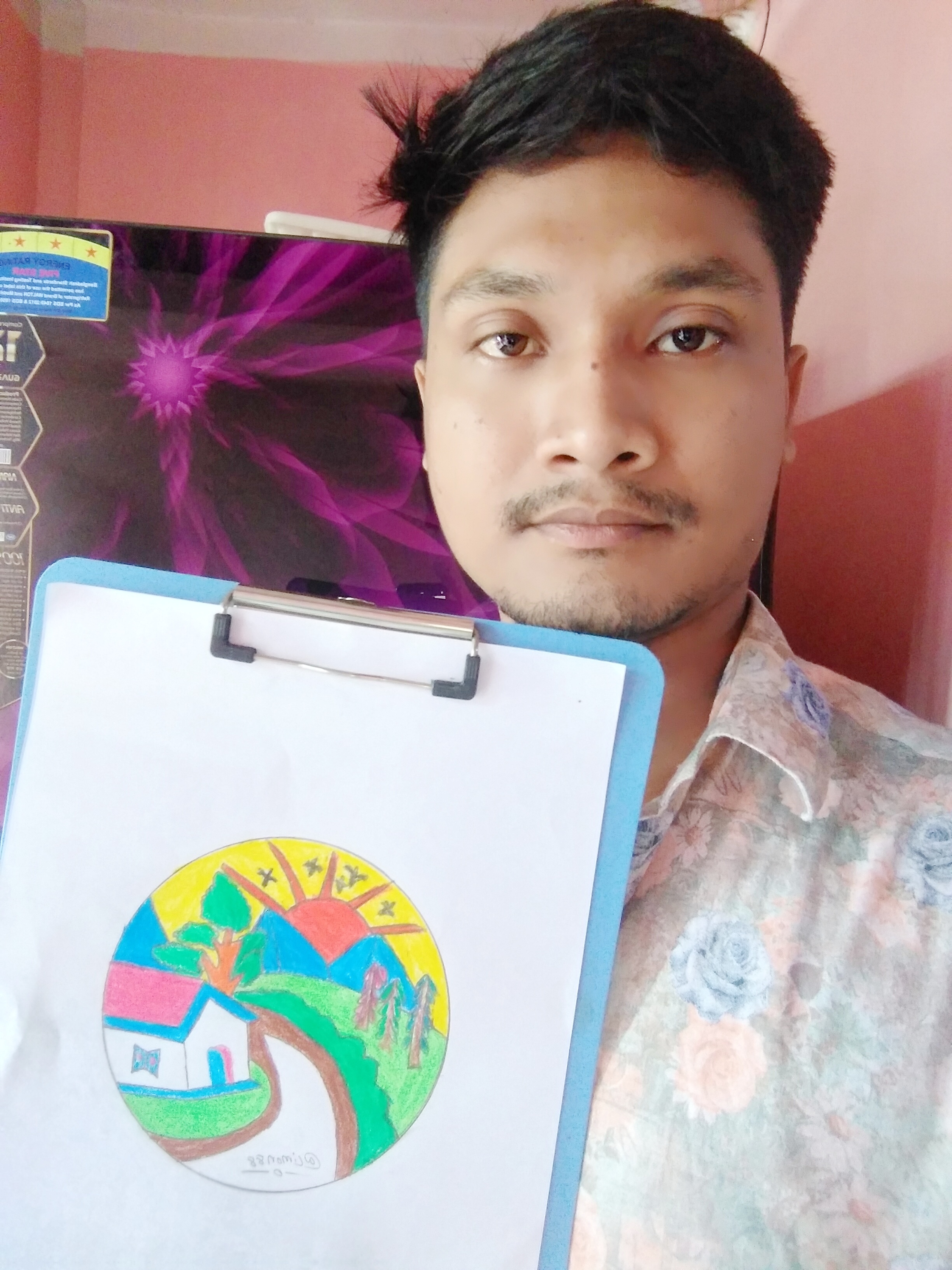 রং পেন্সিল দিয়ে প্রকৃতির দৃশ্য অংকন করা হয়েছে। এবার আমি হাতে নিয়ে সেলফি নিলাম। আজকের অংকন আমার কাছে ভীষণ ভালো লেগেছে। এধরনের প্রকৃতির দৃশ্য অংকন আমি প্রথমবারের মতো অংকন করলাম। আশাকরি আপনাদের সবার ভালো লেগেছে। কেমন লাগলো অবশ্যই জানাবেন। আপনাদের সবার সহযোগিতা কামনা করছি। কোন ভুলত্রুটি হলে ক্ষমা করবেন। আপনাদের সবার মতামত আশা করছি। এই ছিলো আমার আজকের আয়োজন। আজকের মতো এখানেই বিদায় নিলাম। সবাই ভালো থাকুন সুস্থ থাকুন সবসময় এই কামনাই করি।