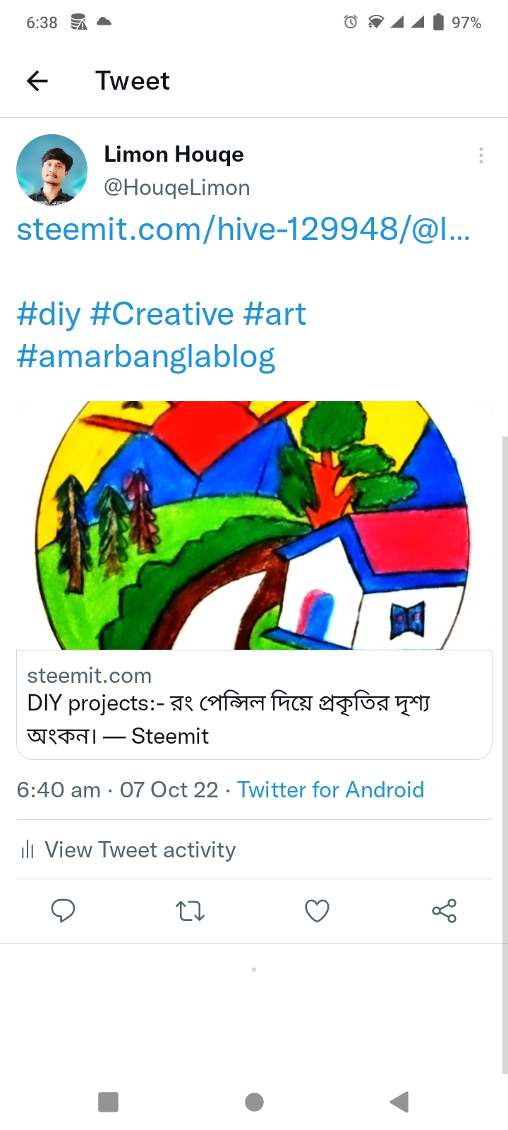 পেন্সিল দিয়ে চিত্র অঙ্কন করতে আমারও খুব ভাল লাগে। আপনি রং পেন্সিল দিয়ে অনেক সুন্দর একটি প্রাকৃতিক চিত্র অঙ্কন করেছেন। আপনার চিত্রে সূর্য, গাছ, পাখি, ঘর, রাস্তা সবকিছুই উপস্থাপন করেছেন। চিত্রাঙ্কনটি আমার অনেক ভাল লেগেছে। ধন্যবাদ ভাইয়া এত সুন্দর একটি চিত্র অঙ্কন করে আমাদের সাথে শেয়ার করার জন্য।