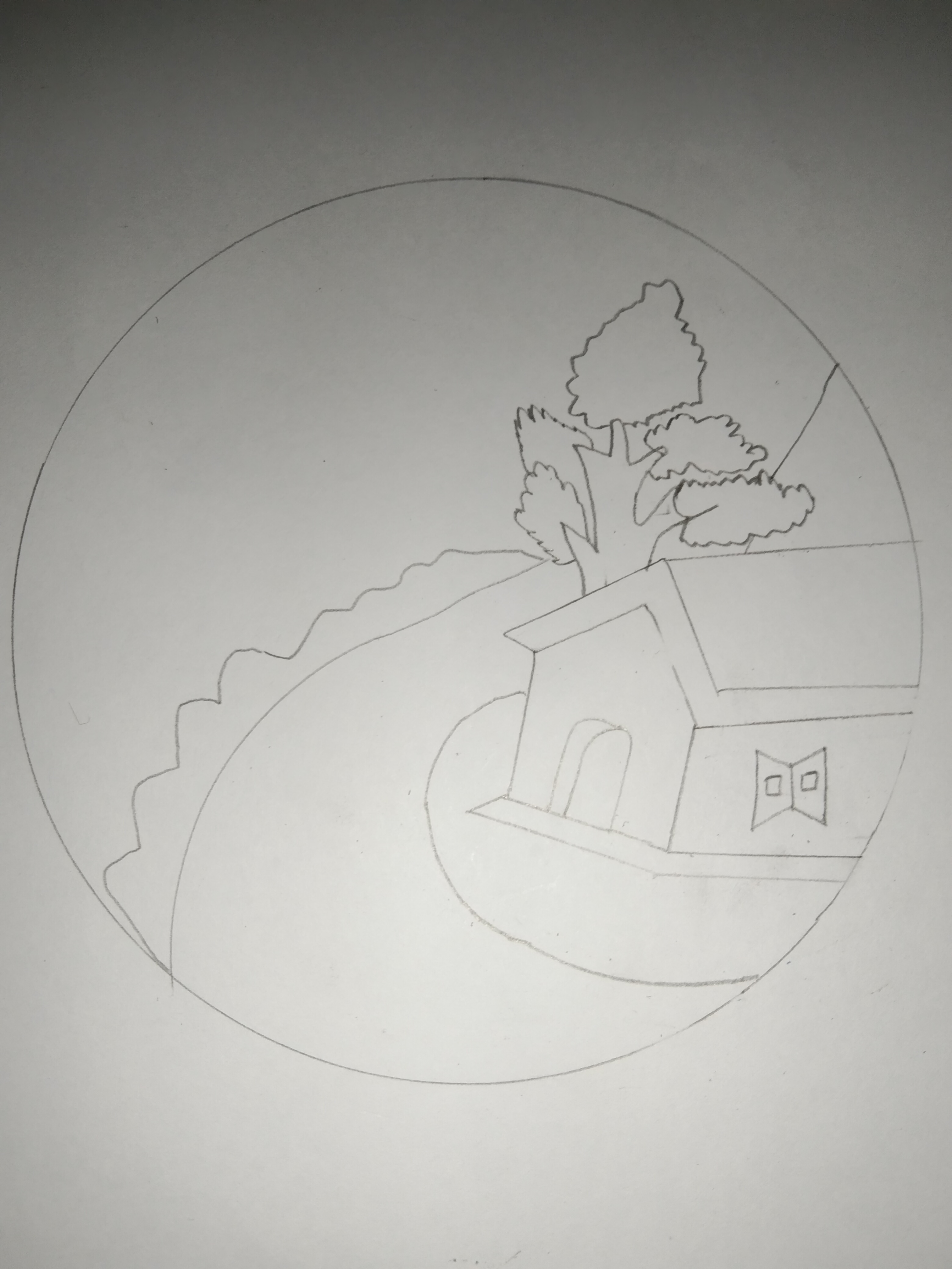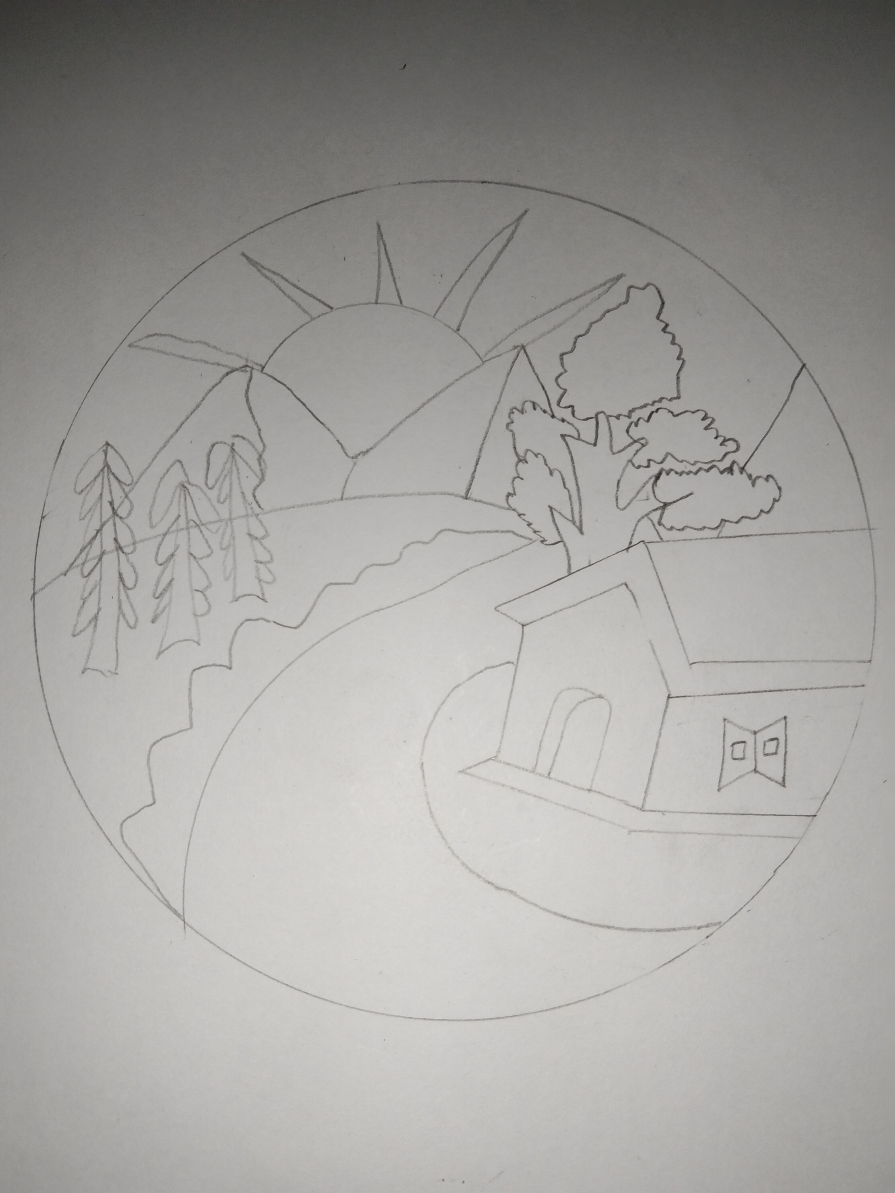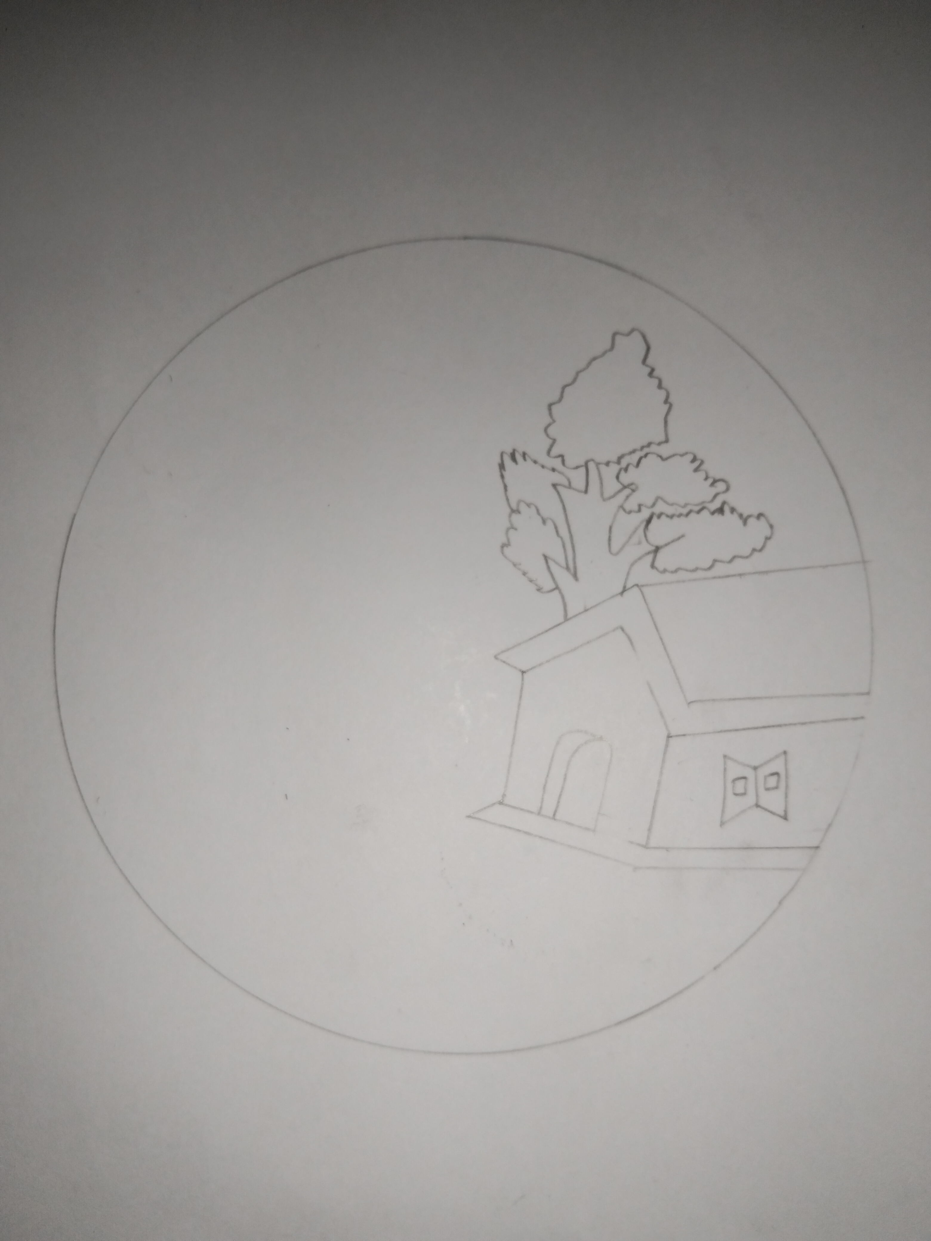 - প্রকৃতির দৃশ্য অংকন করার জন্য আমি হার্ড বোর্ড সাদা কাগজ আর পেন্সিল নিয়ে অংকন করতে বসে পরলাম। এবার আমি প্রথমেই গোল দাগ দিয়ে নিলাম। বাড়ি আর গাছ অংকন করলাম।