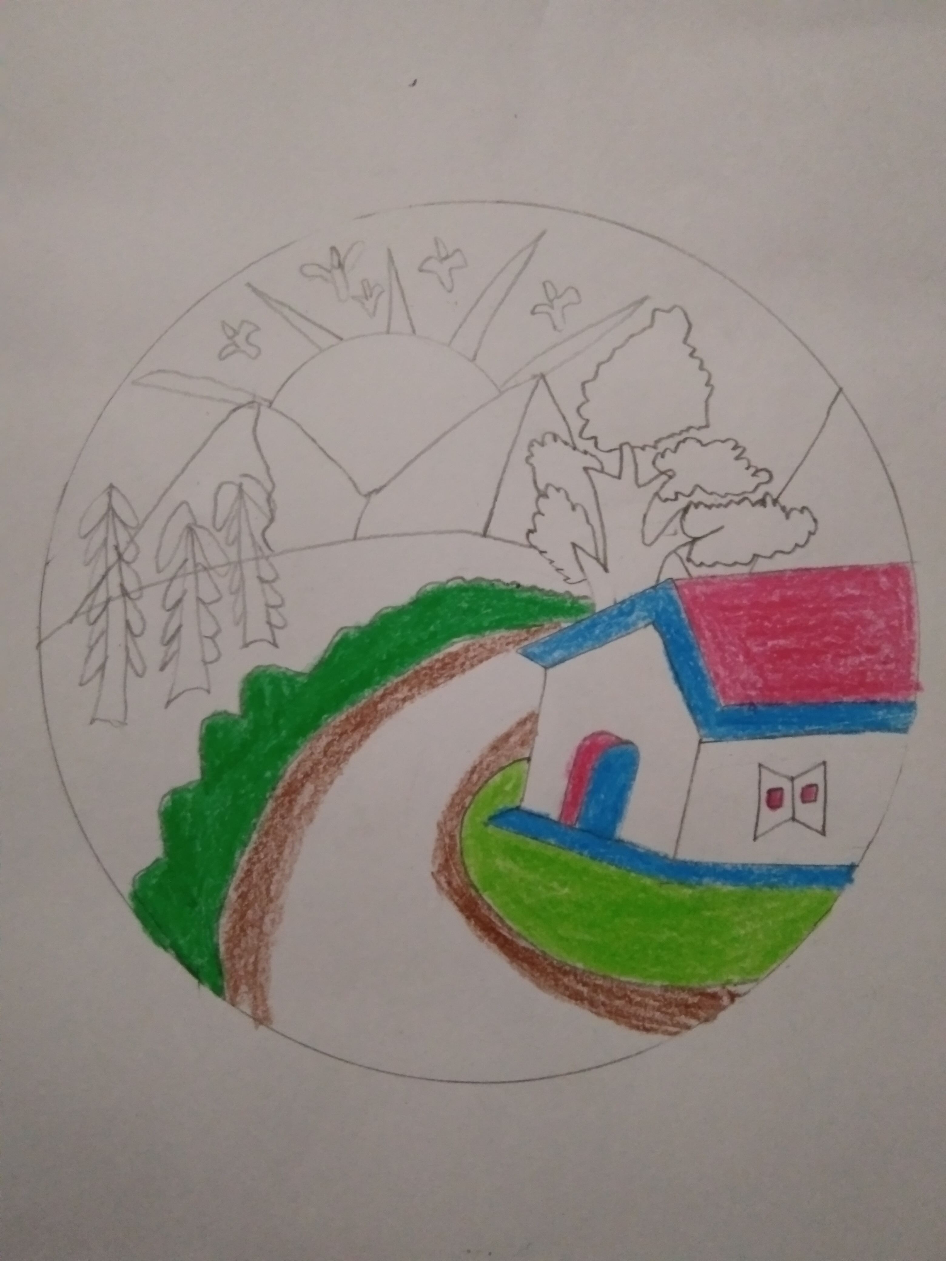 - এবার আমি রং পেন্সিল দিয়ে রং করবো। প্রথমেই আমি বাড়ি রং পেন্সিল দিয়ে রং পেন্সিল দিয়ে রং করলাম। এবার আমি রাস্তায় দুপাশে রং পেন্সিল দিয়ে রং করলাম।