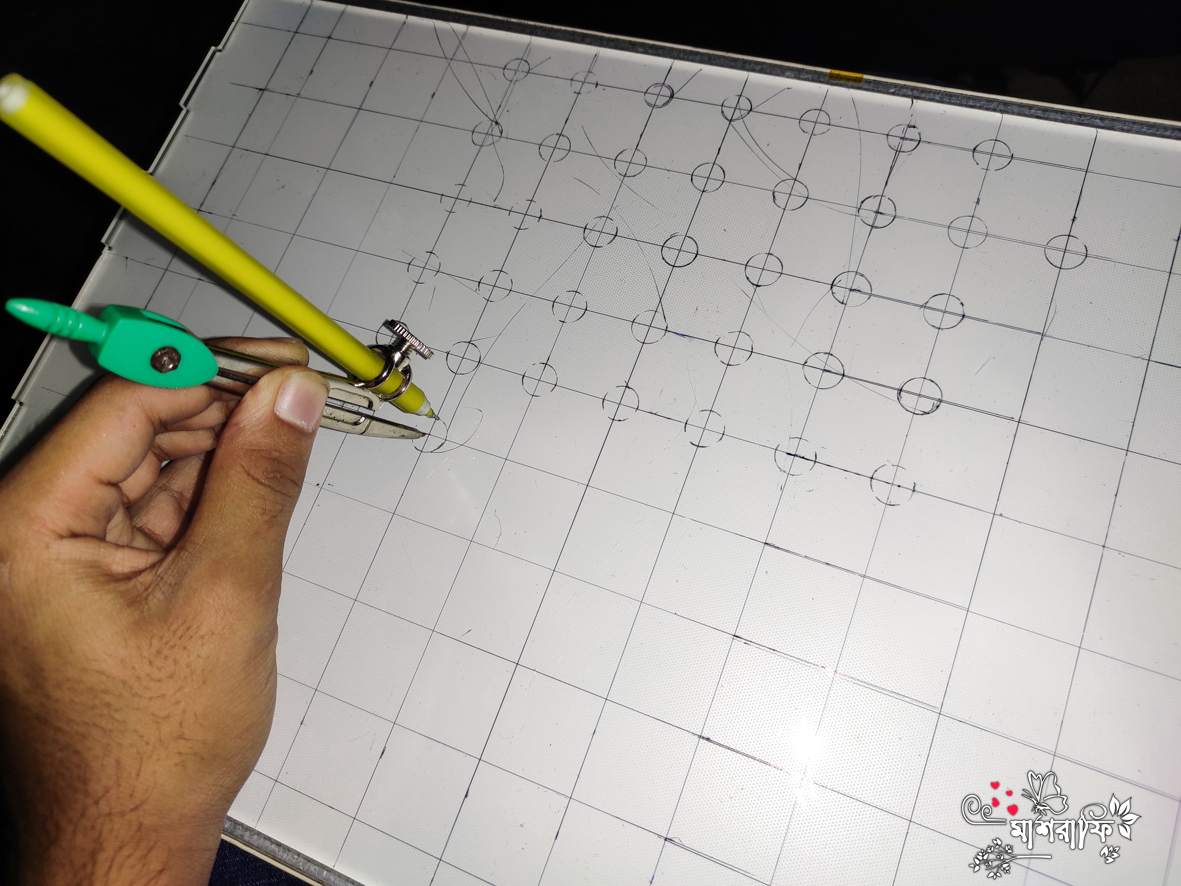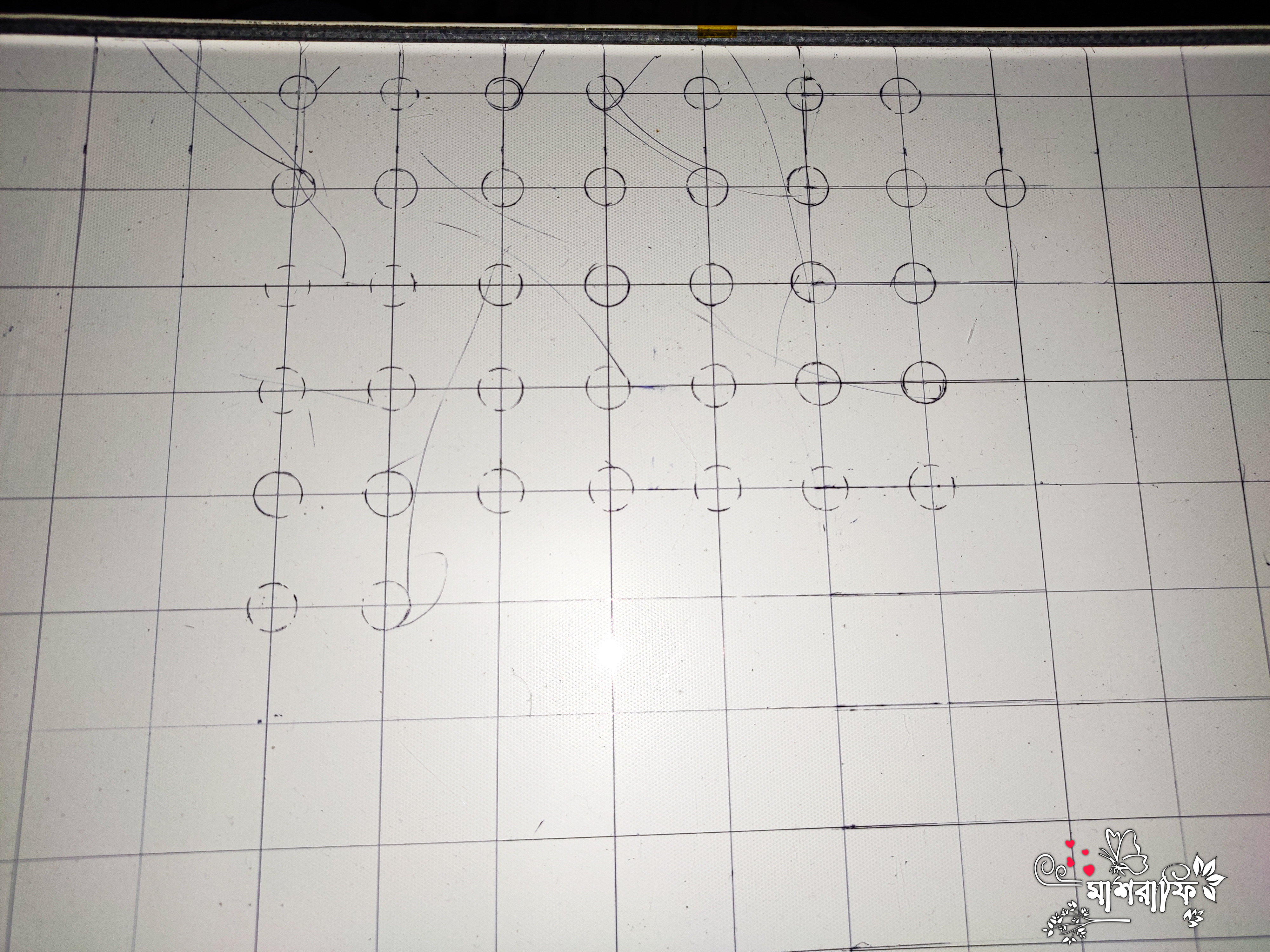 - তারপর আমি মাপ অনুযায়ী দাগ কেটে ,পেন্সিল কম্পাসের সাহায্যে লাইটের মাপ অনুযায়ী গোল করে নিবো (৭×৭) ৪৯ টি ।