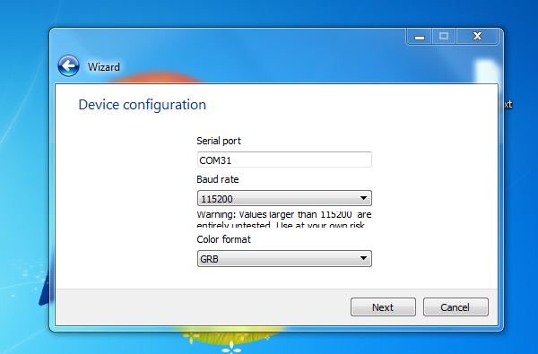 - প্রথমে serial port দিবো ।Baud rate 11500 দিবো।Colour format (GRB) দিবো