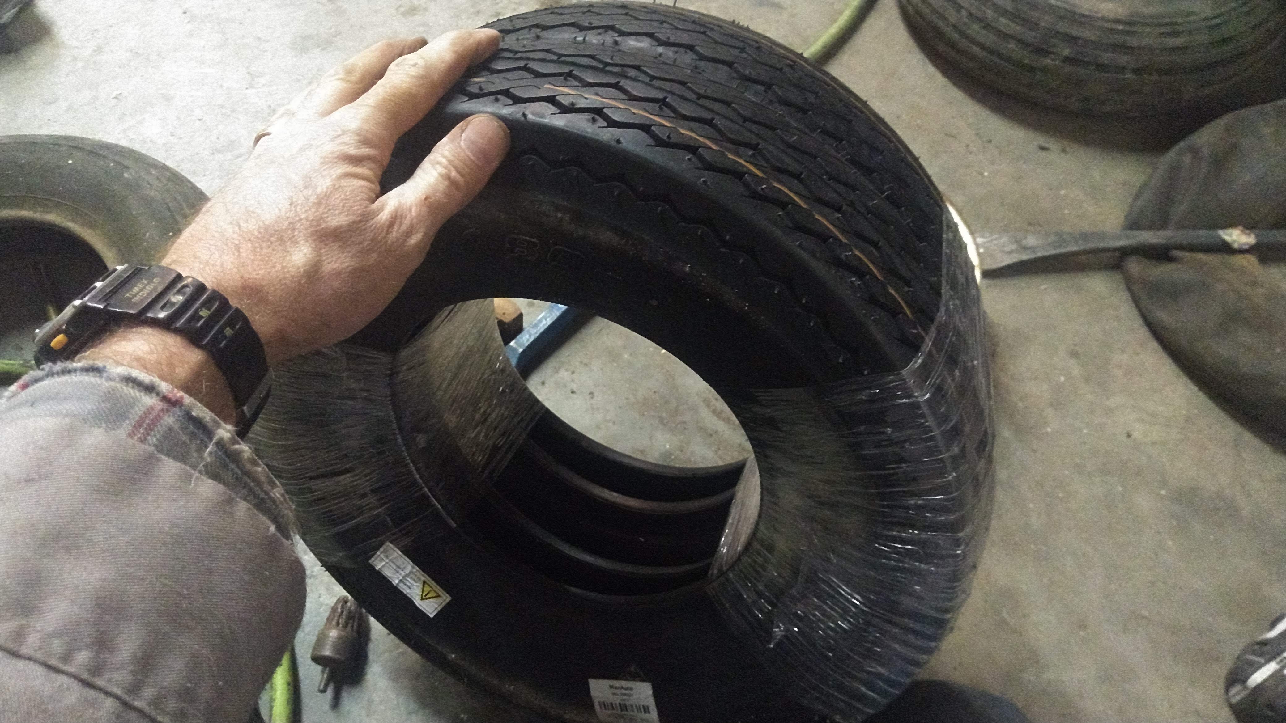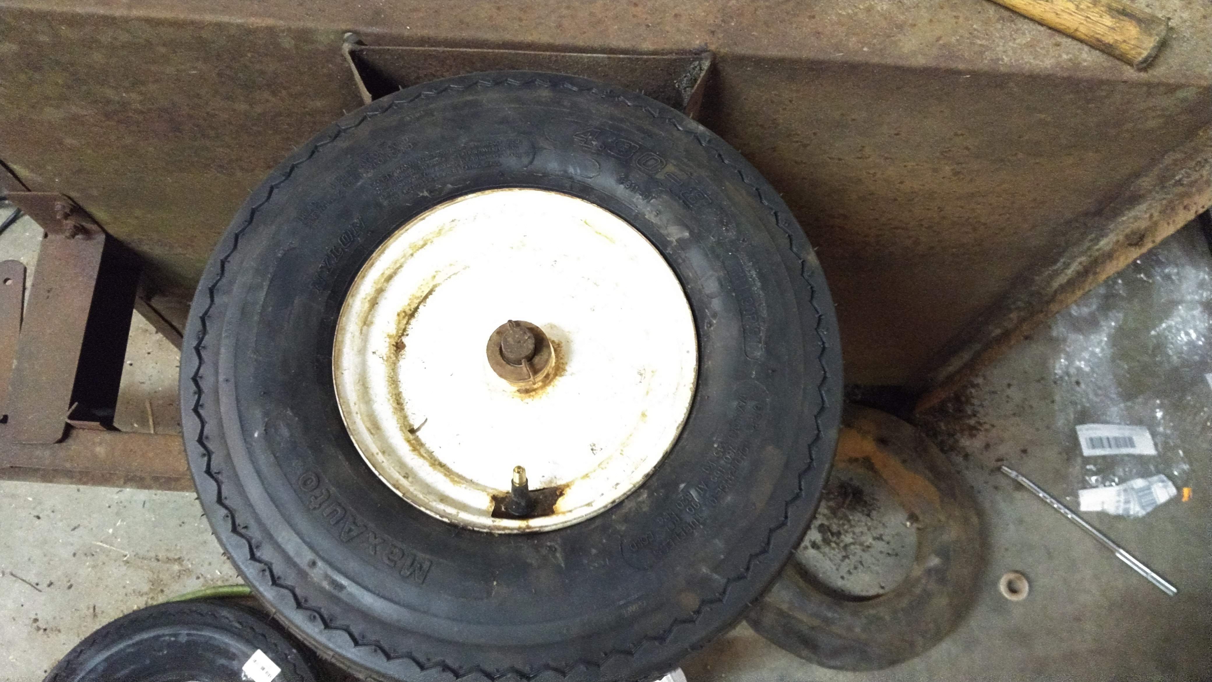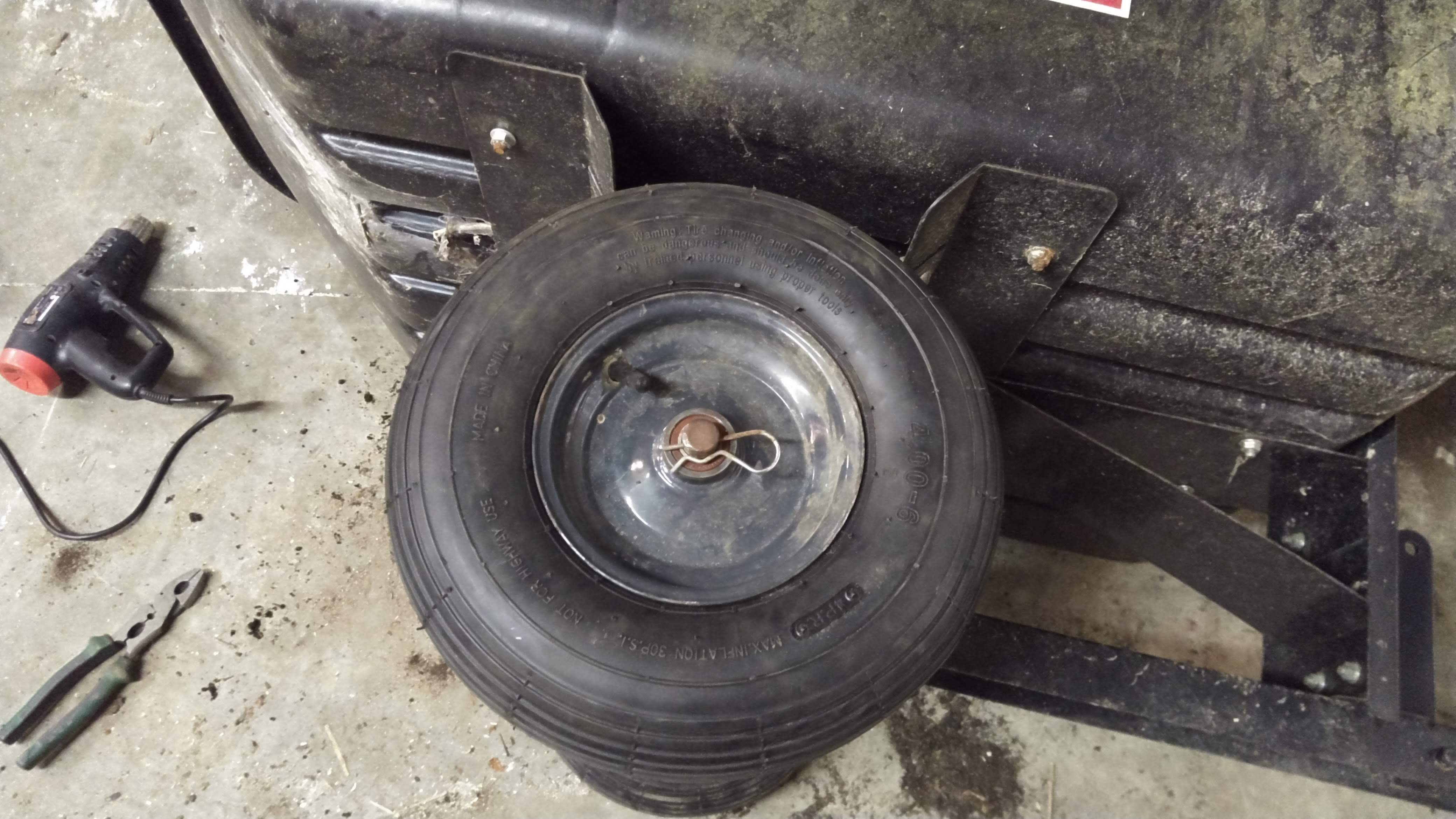The tires on this dump cart are actually the same size as a wheelbarrow tire, which I assumed would be cheap to replace as a result. Not so much. One tire and tube was more than you would pay for some car tires. During the search I came across these trailer tires of the same size, which are actually intended for road use, and the pair of them were just a few bucks more than one wheelbarrow tire. Strange.