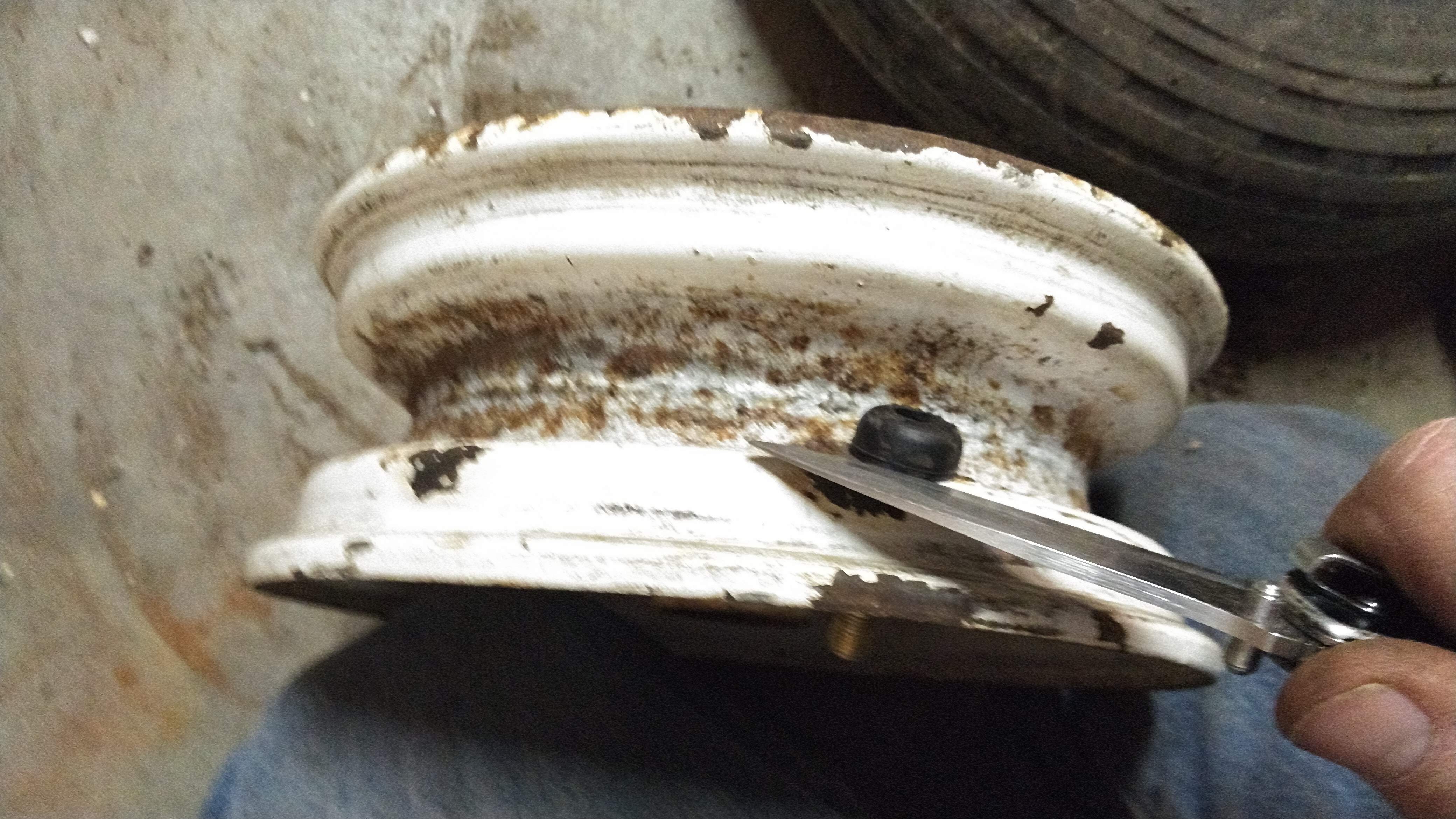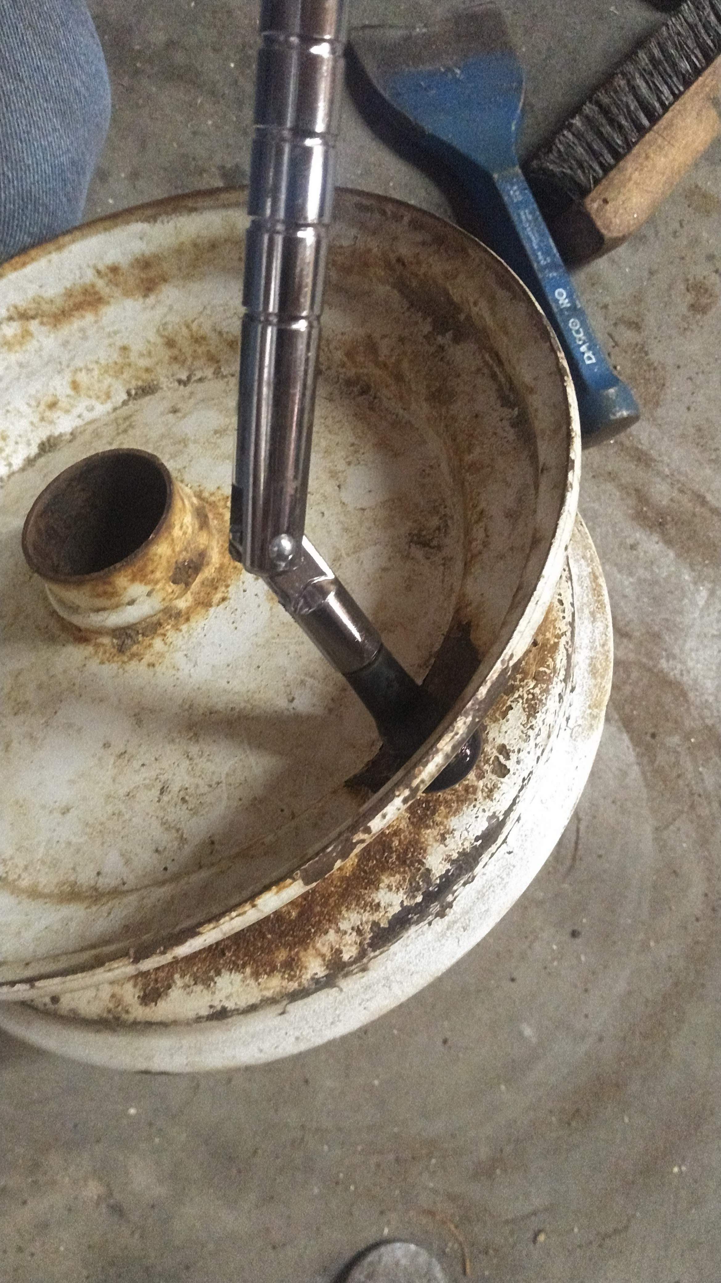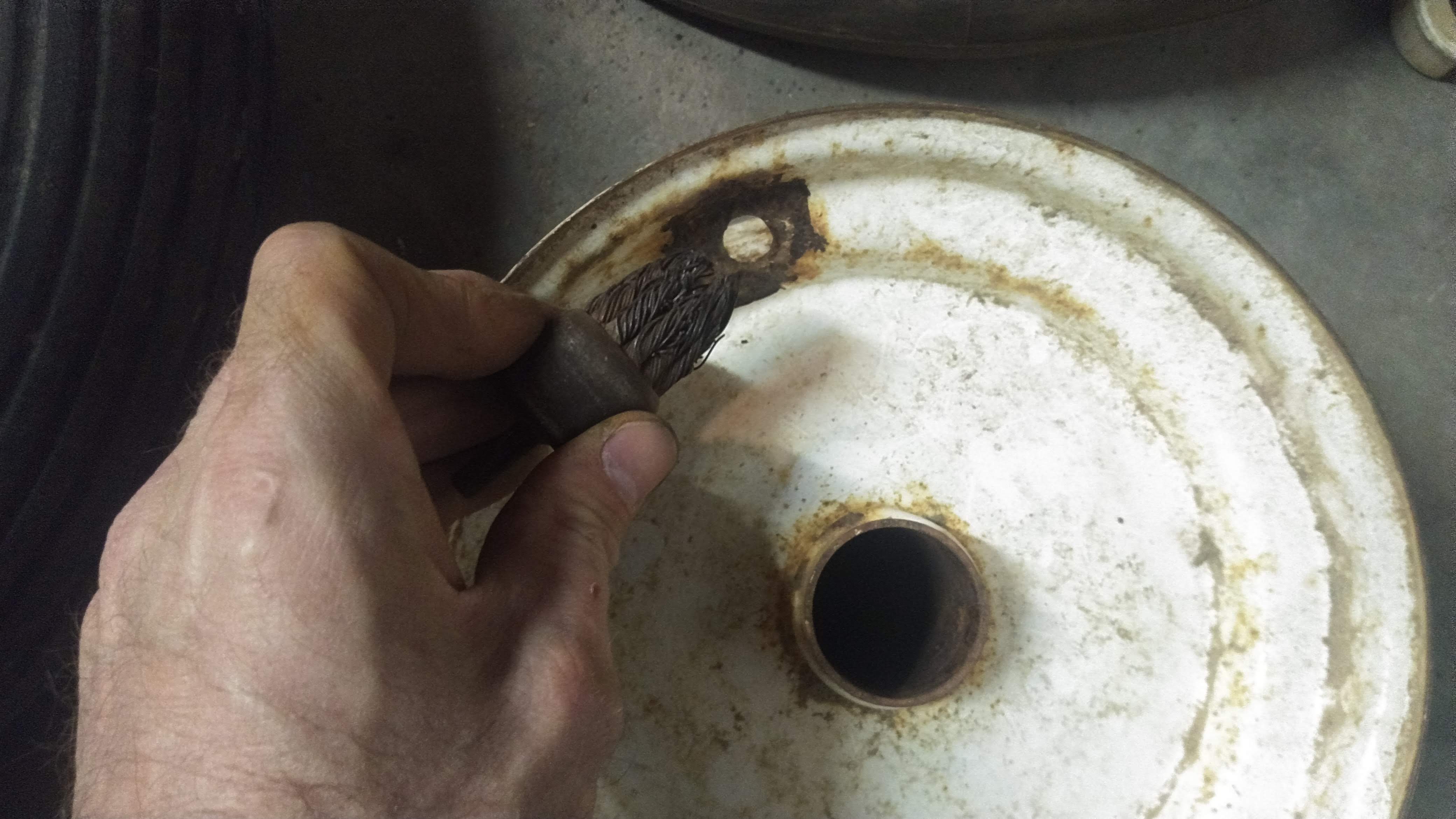 These valve stem holes can actually be kind of messed up and still hold air since the rubber in the valve stem will fill any voids when under pressure. One thing they can't be, however, is full of any loose dirt or rust scale like this one has. This little drill-mounted wire brush is great for cleaning these holes up.