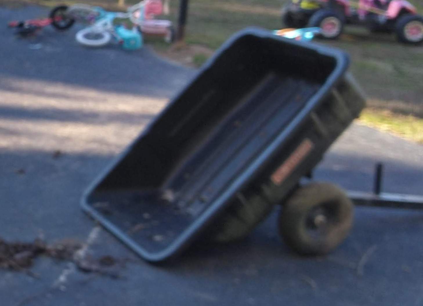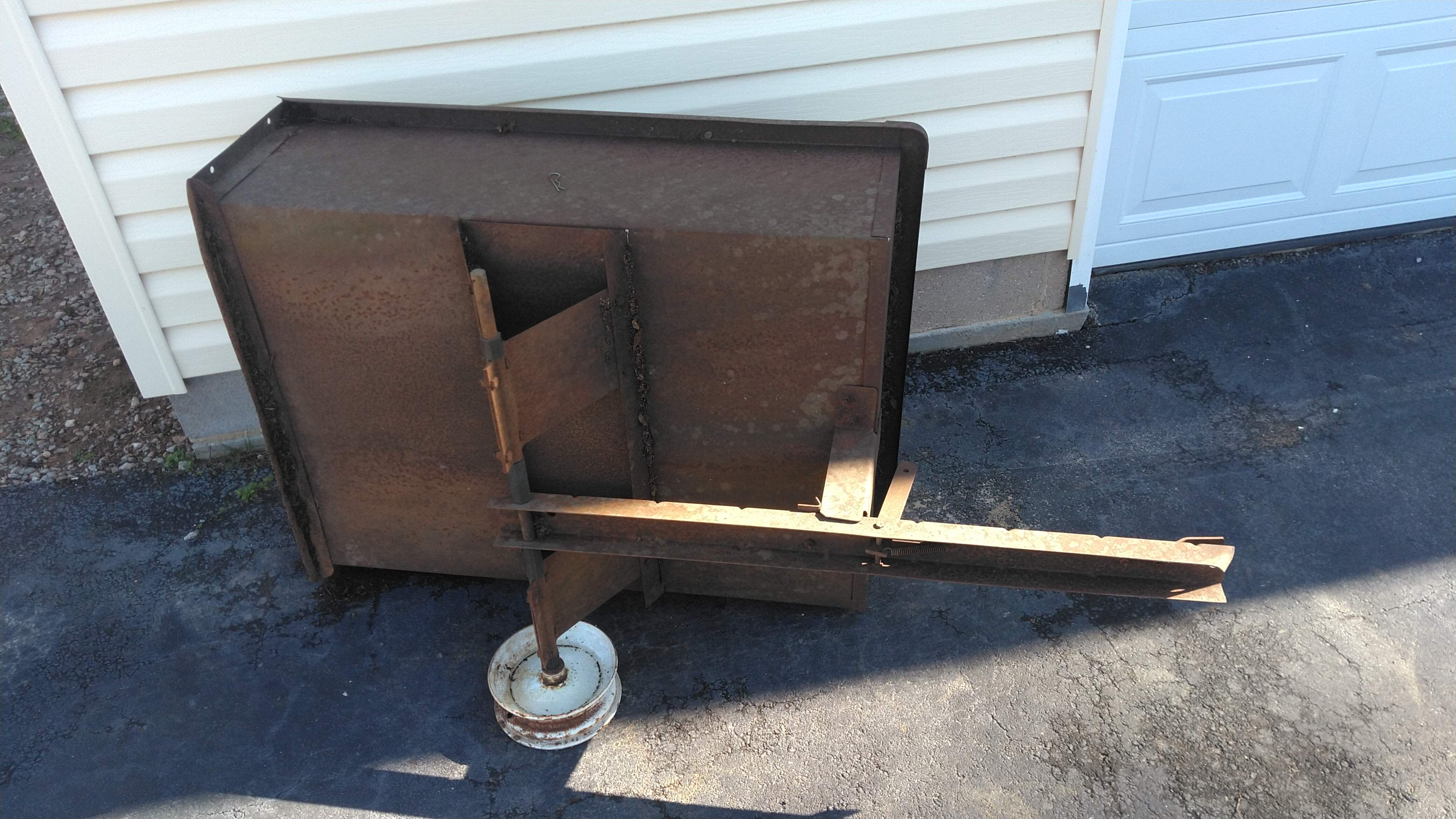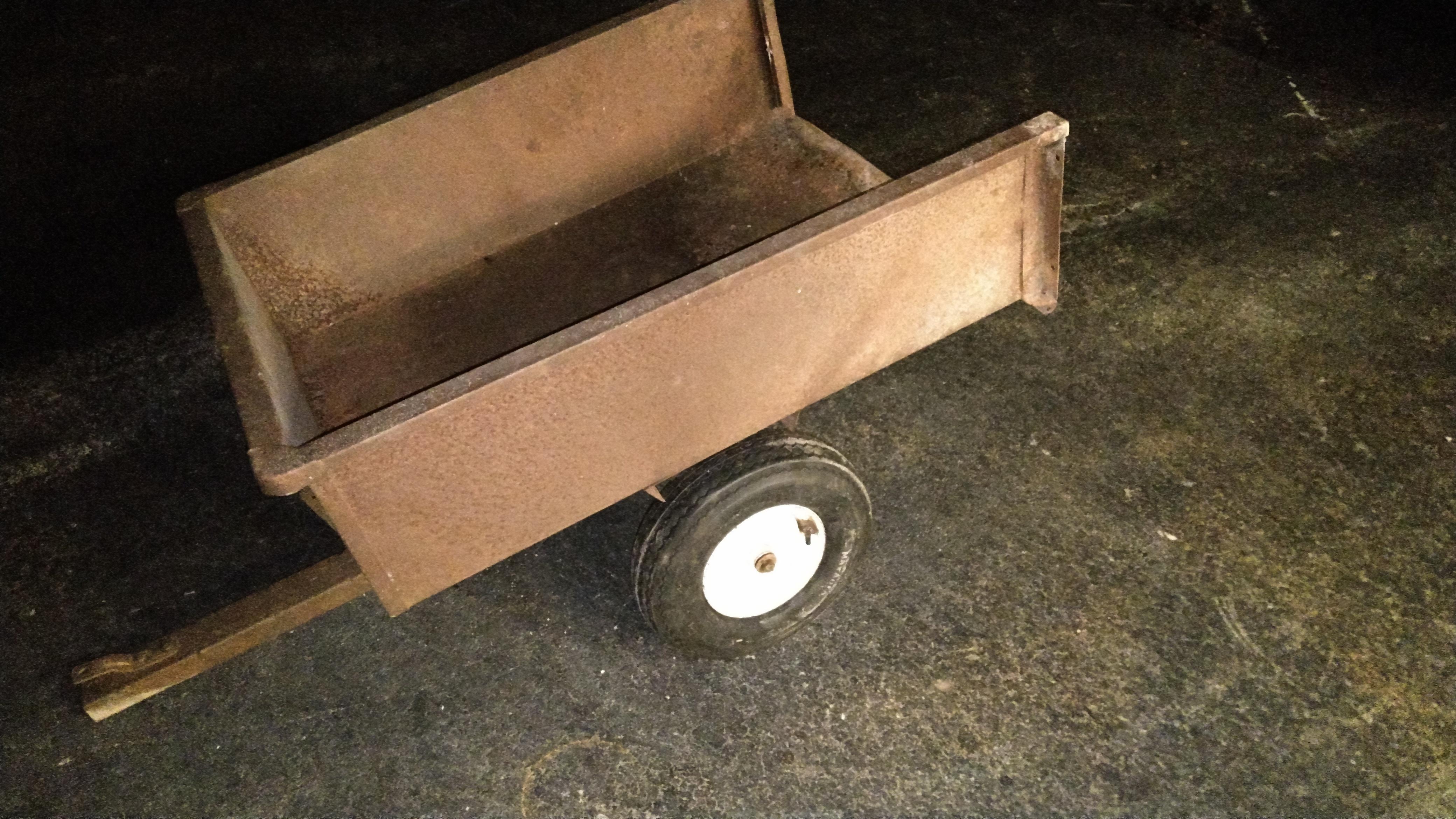 Not being one to easily admit defeat, I decided that I should get a cart to pull behind the lawnmower. Surely the lawnmower, with 20+ horsepower will have enough oomph to pull a wheelbarrow sized load up that steep little hill as long as I can get some traction. That same day I noticed in my neighbor's yard, strangely enough right near my dirt pile, was a couple of these little wagons made for towing behind lawn tractors. Both were in varying states of disrepair, so I figured that since he obviously wasn't using them that maybe he wouldn't mind parting ways with one.