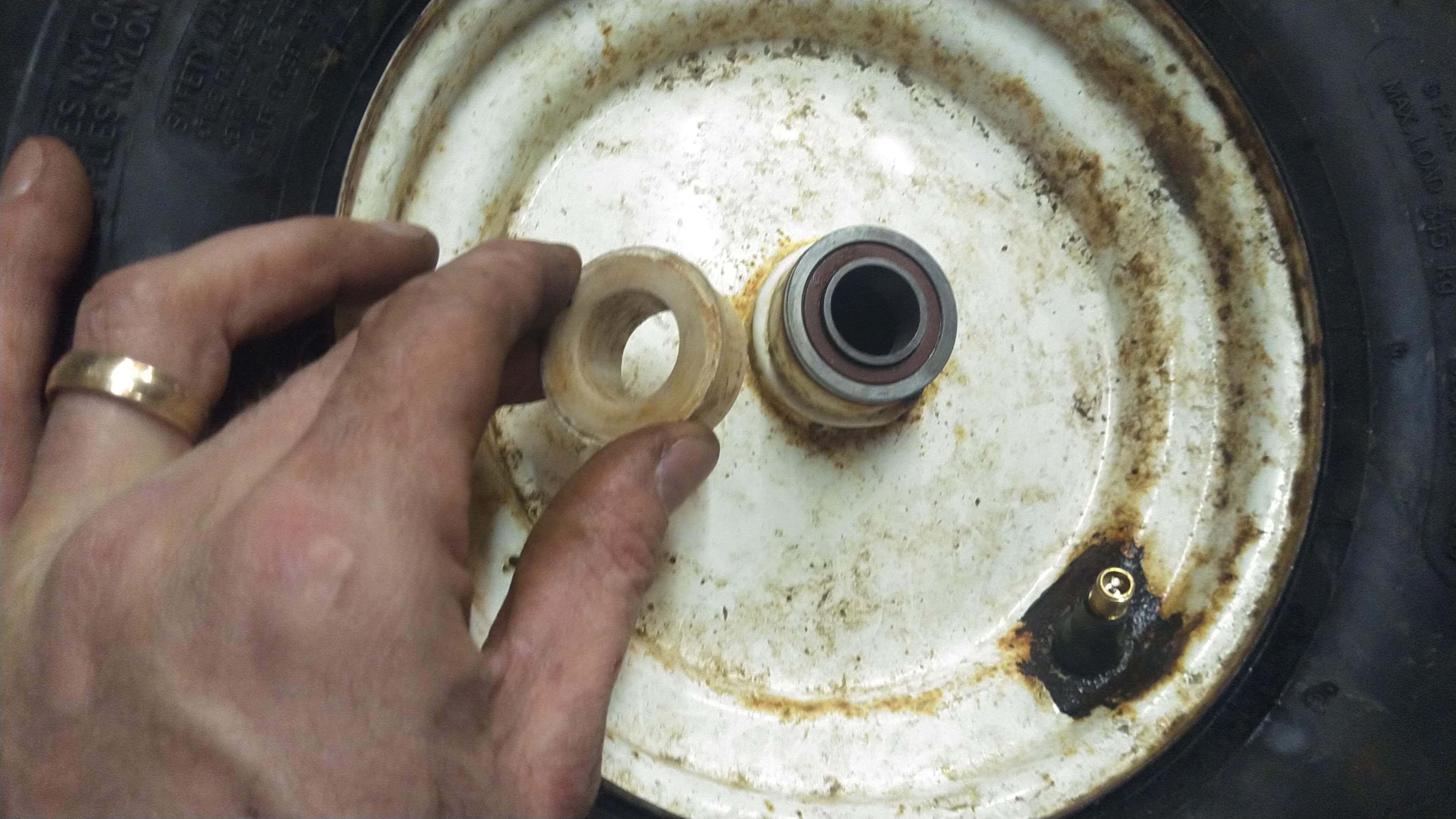 I could write a whole post about how to mount a tire, so I'm skipping over that here. With the tire now mounted to the rim and aired up, the final touch was these new bearings. The cart had these nylon bushings as bearings and they were so wallowed out that the wheels would wobble back and forth about 15 degrees. I bought a pack of 10 of these bearings online for like $15 to replace them.